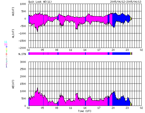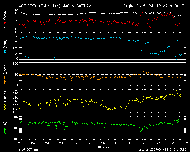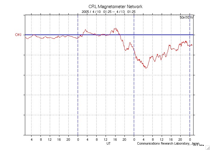 2005/ 4/13 10:27 更新 やや高速の太陽風が続いています(550km/秒)。オーロラ活動も活発に続いています。 担当 篠原 コロナホールによる高速の太陽風が続いています。 速度は550km/秒前後で安定しています。速度としては、やや高速という程度です。 磁場強度は依然10nT程度あります。 弱いですが、南向き成分を持っており、この影響でオーロラ活動も活発に続いています。 AE指数のグラフを見ると、1000nT規模の活発な活動が数度起こり、 500nT前後の変動が連続的に観測されています。 春とともに夜の時間が短くなって来ていますが、 アラスカのオーロラライブカメラでオーロラ鑑賞ができるかもしれません。 最近は、日本時間で17〜21時がお勧め時間とのことです。 沖縄の磁場データは、最大で-80nT程度低下していました。 正確な磁気嵐の指数(Dst)では、-60nT程度の変化が観測されています。 現在は、ほぼ元に戻っています。 SOHO EIT284の太陽写真を見ると、現在コロナホールのまっただ中にいる様です。 もう1〜2日程度、影響が続きそうです。 その後次第に速度が低下して、穏やかな太陽風、磁気圏にもどっていくでしょう。 太陽では、東の端(左端)から752黒点群(まだ番号が書かれていません)が見えて来ました。 やや活発な動きを見せていて、Cクラスの小規模なフレア活動を起こしています。 今後、発達する傾向なのかどうか、注意したいと思います。 SOHO衛星のEIT284カメラの映像 (c) SOHO (ESA & NASA)