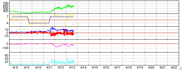 ACEが観測した太陽風の磁場(1番上の枠、白線は全体の強度、赤線は南北成分) および、太陽風の密度(3番目の橙線)、速度(4番目の黄線) (c) NOAA/SEC ![]() リアルタイムAE指数 下段のAEグラフの値が高くなると、オーロラ活動が活発化しています。 (c) 京都大学, NICT ![]() 27日の太陽周期に合わせたデータプロット (太陽風版) 太陽が同じ面を地球に向けていた27日前の変化から、今後を予想することができます。 (c) NICT