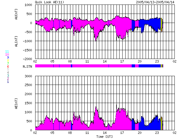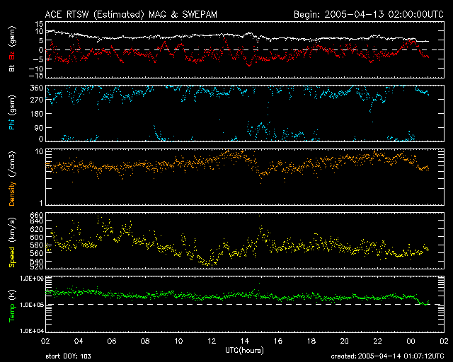2005/ 4/14 10:06 更新 やや高速の太陽風が続いています(550km/秒)。オーロラもとても活発です。放射線帯の高エネルギー電子が増加しつつあります。 担当 篠原 コロナホールの影響で、550〜600km/秒のやや高速の太陽風が継続しています。 27日周期の図で速度の変化を見ると、12日と13日に2段階の山が見えています。 昨日から特徴的な変化として、太陽風磁場が南寄りに推移しているということがあげられます。 ACEのデータを見ると、太陽風の磁場は強度が5〜10nTで、 南北成分(赤線)がマイナス寄りに変化しています。 -5nT前後の南向き磁場がほとんど連続的に観測されており、 高速の太陽風から地球磁気圏へエネルギーが流れ続けていたと思われます。 このため、昨日はオーロラ活動がとても活発でした。 AE指数のグラフを見ると、1000nTを越える大きな変化も含め、 500nT以上の変動が連続的に観測されています。 (オーロラの活動は間欠的な性質を持っているので、いくつもの山が連続する様なグラフになります) SOHO EIT284の太陽写真を見ると、 この高速風をもたらしているコロナホールは西側(右側)へ去りつつあります。 高速風のピークを既に迎えていると思われます。 これから次第に速度が低下を始めるでしょう。 明日には通常の速度レベルに戻っているのではないでしょうか。 それとともに、オーロラ活動も低下して行きます。 その後はしばらく穏やかな日が続くでしょう。 今回の高速太陽風の影響を受けて、放射線帯の高エネルギー電子が増加しています。 青線のGOES10が警戒ライン(10の4乗)に達しています。 明日以降、更に増加している可能性がありますので注意して下さい。 太陽のフレア活動はとても穏やかです。 東から上って来た752黒点群も、昨日は静かでした。規模も小さい黒点群です。 また、太陽の中心やや上寄りに、小さな753黒点群ができています(番号はまだ書かれていません)。 SOHO衛星のEIT284カメラの映像 (c) SOHO (ESA & NASA)