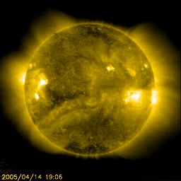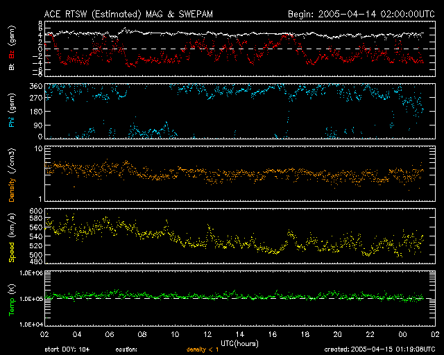 2005/ 4/15 10:21 更新 太陽風はやや速い状態が続いています(520km/秒)。オーロラ活動もやや活発に続いています。 担当 篠原 コロナホールの影響はまだ続いています。 緩やかに低下しつつありますが太陽風の速度はまだやや速く、約520km/秒です。 太陽風磁場強度は4nTに下がっていますが、南北成分は緩やかな振動を続けていて、 オーロラ活動に繋がる磁場の南向き成分も運んでいます。 そのため、オーロラ活動は現在もやや活発に続いています。 しかし、速度が下がって来たことと、磁場強度が落ちているために、 太陽風から磁気圏へのエネルギーの流れ込みは弱まっており、全体的な活動度は下がっています。 SOHO EIT284の太陽写真では、コロナホールはすっかり西の方に消えてしまいました。 太陽風の速度は更に低下を続けていって、やがて穏やかな状態に戻るでしょう。 それとともにオーロラの活動も弱まって行くでしょう。 放射線帯の高エネルギー電子の密度は、昨日と比べてもう一段上昇しています。 GOES10に続いてGOES12衛星でも警戒ラインに達しつつあります。 電子密度は更に上昇する可能性がありますので、引き続き注意が必要です。 太陽のフレア活動はとても穏やかです。 752黒点群の様子がよく見える様になりました。 その下に新しく754黒点群が現れています。 黒点群はどれも小規模で、活動度も低い状態です。 SOHO衛星のEIT284カメラの映像 (c) SOHO (ESA & NASA)
