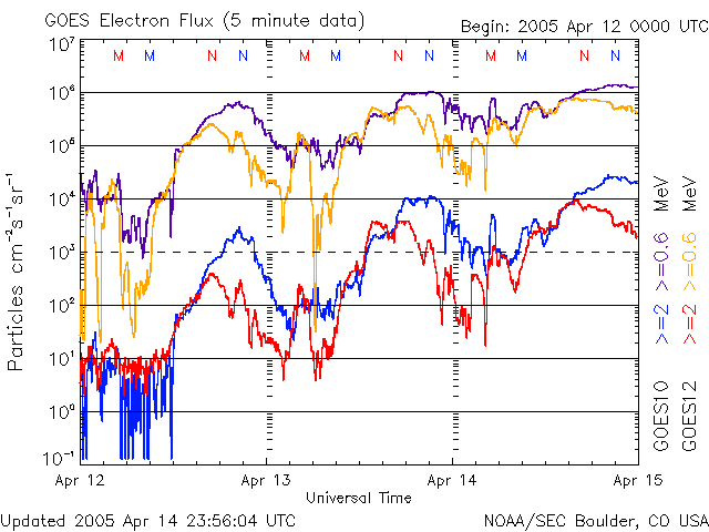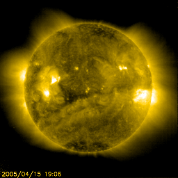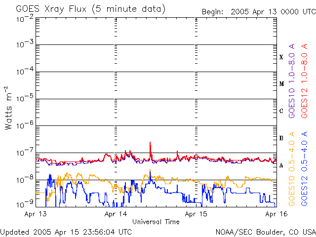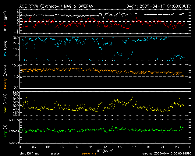 2005/ 4/16 09:06 更新 オーロラはやや活発な状態が続いています。放射線帯の高エネルギー電子が増加しています。 担当 篠原 太陽風の速度は500km/秒前後を推移しています。 磁場強度は4nT、南北成分が振動しながら南寄り(マイナス成分)傾向で変化しています。 -3nT程度の南向き成分が連続的に現れているため、オーロラ活動を刺激し続けています。 AE指数のグラフを見ると、500nT程度の小規模の活動が連続的に発生している様です。 速度がだいぶ下がって来ましたので、活動の規模は次第に小さくなっています。 引き続き、太陽風の速度は緩やかに低下して行くと思われます。 SOHO EIT284の太陽写真を見ると、中心やや左に小さなコロナホールが見えています。 規模が小さいので、大きな影響はないでしょう。 数日間、穏やかな日が続くと思われます。 明日、明後日になると、前周期(27日周期)に地球に影響を及ぼしていた、 大きなコロナホールが見えて来ます。 現在はどの程度の規模になっているでしょうか。 放射線帯の高エネルギー電子は、更に密度が高まっています。 GOES10(青線)、GOES12(赤線)のグラフが10の4乗の線を越えると、 衛星の運用などで障害が起こり易くなると言われています。 しばらくの間この状態が続きそうです。 太陽のフレア活動は静かです。 GOES衛星のX線グラフは、ほとんど変化を観測していません。 SOHO衛星のEIT284カメラの映像 (c) SOHO (ESA & NASA)