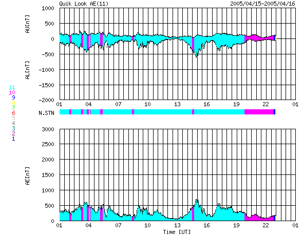ACEが観測した太陽風の磁場(1番上の枠、白線は全体の強度、赤線は南北成分) および、太陽風の密度(3番目の橙線)、速度(4番目の黄線) (c) NOAA/SEC ![]() リアルタイムAE指数 下段のAEグラフの値が高くなると、オーロラ活動が活発化しています。 (c) 京都大学, NICT ![]() GOES衛星による、静止衛星軌道における高エネルギー電子の変化 (c) NOAA/SEC ![]() SOHO衛星のMDIカメラによる太陽黒点 (c) SOHO (ESA & NASA) ![]() GOES衛星の太陽X線データ (c) NOAA/SEC ![]() | ||||||||||||||||||||||||||||||||||||||||