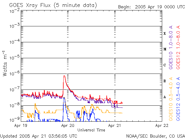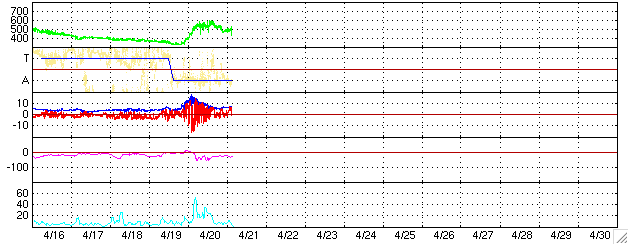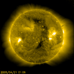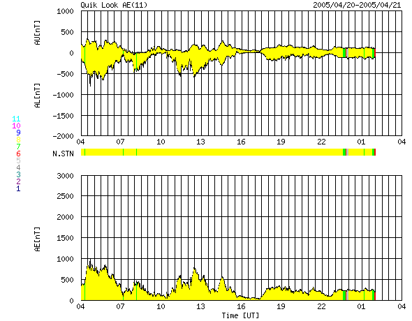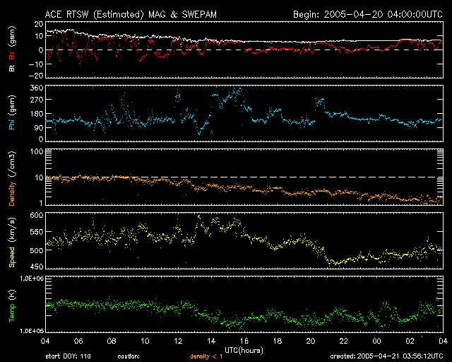 2005/ 4/21 12:57 更新 太陽風の速度がやや高く(500km/秒)、オーロラもやや活発です。一旦穏やかになり、明後日頃に再び乱れそうです。 担当 篠原 コロナホールによる、高速太陽風の領域に地球が入っています。 昨日、速度が上がり始めていることをお知らせしましたが、 太陽風の速度はその後20日22時(世界時20日13時)頃に最高600km/秒に達しています。 太陽風の速度が上昇していた頃、太陽風の磁場強度も10nT前後まで強まっていました。 南北成分が短時間で変化していたため、南向き成分の磁場が強く頻繁に現れ、 オーロラ活動が活発に発生していました。 500〜1000nT規模の活動がAE指数のグラフで観測されています。 太陽風の速度はピークに達した後、低下して現在は500km/秒です。 磁場強度も7nT程度に弱まっています。 磁場の南北成分の振動もほとんど無くなって、オーロラ活動は弱まっています。 今回の擾乱は、コロナホールの第一陣と言えるもので、 これから第二陣の影響が始まると予想されます。 SOHO EIT284の太陽写真をご覧下さい。 昨日は太陽の中心を縦に走っていたコロナホール(やや暗い領域)が、西に行き過ぎた場所に移動しています。 もう2日ほどすると、この領域からの高速風が地球に当たる様になるでしょう。 明後日以降は再び宇宙天気が乱れ気味になりますので、注意して下さい。 20日6時半(世界時19日21時半)のB8.0(Cクラスのもう一段下の規模です)の小さなフレアによって発生した CME(太陽ガスの放出現象)の様子がSOHO衛星LASCO C3カメラで捉えられています。 地球に対して横を向いて飛び出していますので、たいした影響は見られないでしょう。 その後は755黒点群を含めて太陽のフレア活動はとても穏やかです。 SOHO衛星のEIT284カメラの映像 (c) SOHO (ESA & NASA)