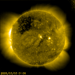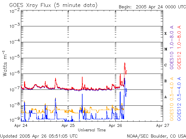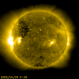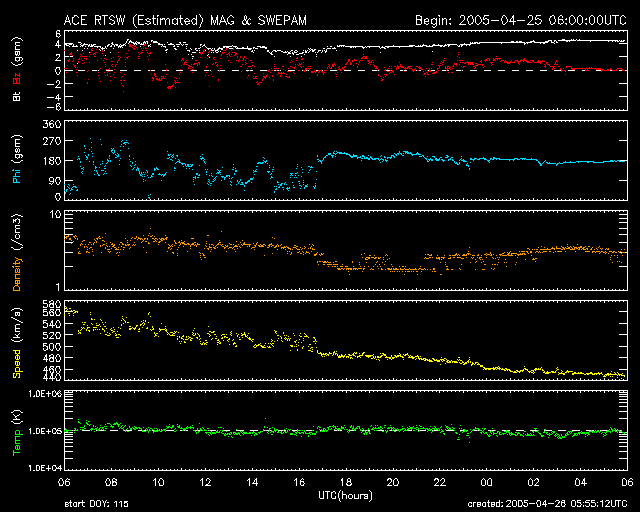 2005/ 4/26 14:56 更新 太陽風の速度は低下を続けています(450km/秒)。これから5日程度穏やかな日が続きそうです。 担当 篠原 太陽風の速度が緩やかに低下を始め、450km/秒まで下がりました。 地球は、コロナホールの高速風領域を抜けつつある様です。 磁場強度は4nTと通常レベルです。 南向き磁場の影響で、500nT前後の小規模なオーロラ活動がAE指数のグラフで見られていますが、 速度が下がった事で、今後は穏やかになっていくでしょう。 SOHO EIT284カメラの太陽写真を見ると、中央から右半分はのっぺりとした姿になっています。 このため、これから5日間程度は穏やかな状態が続くのではないでしょうか。 太陽の左上に丸くコロナホールが見えています。 このコロナホールが次の太陽風の乱れの原因となるでしょう。 このコロナホールは太陽が同じ面を地球に向けていた1周期前、2周期前それぞれにも存在して、 高速の太陽風を地球に届けていました。 しかし、その時の写真と比較するとコロナホールの存在は薄くなっており、勢力が弱まっていると思われます。 参考のため2周期前の太陽の写真を掲載します。 コロナホールが面積、濃さともに弱まっているのがお分かりでしょうか。 2周期前の時は、太陽風は速度が800km/秒に達し、高速風は6日間続きました。 1周期前は、最高速度は700km/秒、高速風の継続時間は3日半に縮まっていました。 今周期はどうなるでしょうか。5月1日頃に影響が現れると思われます。 太陽面では、東から756黒点群が上って来ました。 やや活動的な領域の様で、GOES衛星のX線動画でもしばしば明滅を起こしていました。 そして先ほど、13時半(世界時4時半)にC5.4の小規模フレアを起こしました。 今後どの程度の活動を起こすのか、引き続き注目が必要です。 SOHO衛星のEIT284カメラの映像 (c) SOHO (ESA & NASA)