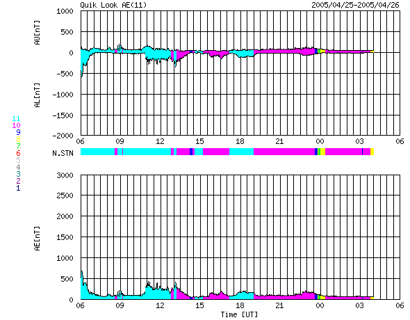 ACEが観測した太陽風の磁場(1番上の枠、白線は全体の強度、赤線は南北成分) および、太陽風の密度(3番目の橙線)、速度(4番目の黄線) (c) NOAA/SEC ![]() リアルタイムAE指数 下段のAEグラフの値が高くなると、オーロラ活動が活発化しています。 (c) 京都大学, NICT ![]() SOHO衛星のMDIカメラによる太陽黒点 (c) SOHO (ESA & NASA) ![]() GOES衛星の太陽X線データ (c) NOAA/SEC ![]() | |||||||||||||||||||||||||||||||||||||||||