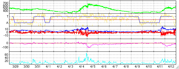 ACEが観測した太陽風の磁場(1番上の枠、白線は全体の強度、赤線は南北成分) および、太陽風の密度(3番目の橙線)、速度(4番目の黄線) (c) NOAA/SEC ![]() リアルタイムAE指数 下段のAEグラフの値が高くなると、オーロラ活動が活発化しています。 (c) 京都大学, NICT ![]() 27日の太陽周期に合わせたデータプロット (太陽風版) 太陽が同じ面を地球に向けていた27日前の変化から、今後を予想することができます。 (c) NICT
