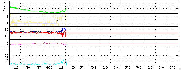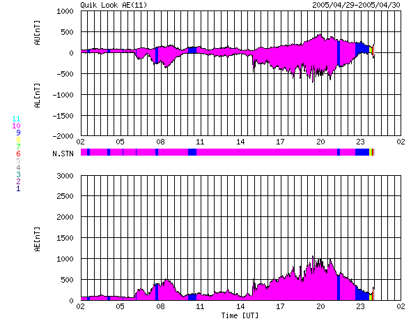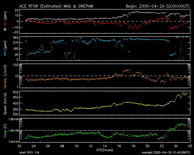 2005/ 4/30 10:36 更新 太陽風の磁場が乱れ、オーロラが活発になっています。速度も上昇を始めており、コロナホールの影響が始まった様です。 担当 篠原 太陽風で乱れが発生しています。 30日1時(世界時29日16時)頃から太陽風の磁場が急激に強まり、15nTに達しました。 その時の南北成分(ACEの赤線)の変化を見ると、とても強い-10nTの南向き(マイナス成分)が現れています。 太陽風の磁場が南を向くと、太陽風から地球の磁気圏にエネルギーが流れ込み、 オーロラ活動が活発になります。 オーロラ電流の強さを測っているAE指数のグラフを見ると、 500〜1000nTの活発な活動が観測されています。 太陽風磁場の南向き成分は、一旦減少しましたが、 30日8時(世界時29日23時)頃から再び-10nTの強い南向きに戻っています。 現在も極域ではオーロラ活動が活発に進行しているのではないかと思われます。 磁場の強まりに遅れて、30日8時(世界時29日23時)頃から太陽風の速度にも変化が現れています。 速度が350km/秒から450km/秒に上昇し、さらに500km/秒にも達しそうです。 予想よりも早く、コロナホールの高速風領域に入ったのかもしれません。 速度が上昇を始めたことで、南向き磁場が継続すると、 今後はオーロラ活動もより規模が大きくなります。 磁気嵐も発達する可能性があります。 これから5月2日くらいにかけて、注意が必要でしょう。 756黒点群は現在も大きな規模を保っています。 X線のグラフを見ると、目立ったフレア活動もなく、やや落ち着いているようにも見えます。 しかし、動画で1日の様子を見てみると、 小さな爆発活動が頻繁に発生しており、やがて大きなフレアを起こしそうな元気さを感じさせます。 中規模フレアへの注意は引き続き必要でしょう。 SOHO衛星のEIT284カメラの映像 (c) SOHO (ESA & NASA)