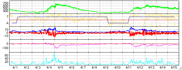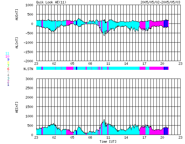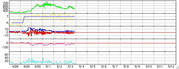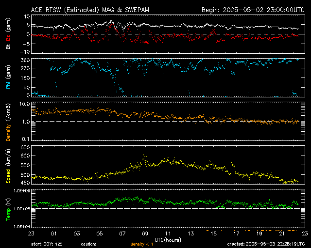SOHO衛星のMDIカメラによる太陽黒点 (c) SOHO (ESA & NASA) ![]() GOES衛星の太陽X線データ (c) NOAA/SEC ![]() ACEが観測した太陽風の磁場(1番上の枠、白線は全体の強度、赤線は南北成分) および、太陽風の密度(3番目の橙線)、速度(4番目の黄線) (c) NOAA/SEC ![]() リアルタイムAE指数 下段のAEグラフの値が高くなると、オーロラ活動が活発化しています。 (c) 京都大学, NICT ![]() 27日の太陽周期に合わせたデータプロット (太陽風版) 太陽が同じ面を地球に向けていた27日前の変化から、今後を予想することができます。 (c) NICT