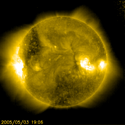 2005/ 5/ 4 07:26 更新 758黒点群がC8の小規模フレアでCMEを発生させています。横向きですので、地球への影響はないでしょう。 担当 篠原 昨日、3日7時(世界時2日22時)にC8.0の小規模フレアを発生させた758黒点群が、 太陽のこちら側に回ってきて姿を現しました。 太陽の写真をご覧ください。 黒点群としてはそれほどの規模ではない様です。 C8.0の小規模フレアは長時間続くタイプのもので、CME(太陽ガスの放出現象)を発生させています。 SOHO衛星のLASCO C3カメラの連続写真をご覧ください。 地球から見て横方向に、太陽のプラズマが激しく吹き出している様子が見えています。 この発生がもう数日遅れていれば地球への影響は免れなかったと思いますが、 今回はほぼ真横を向いていますので、たいした影響は見られないでしょう。 758黒点群の今後の動きはどうなるでしょうか。 一方、756黒点群は規模をやや縮小している様です。 フレア活動も起きておらず、穏やかになっています。 ただ、規模が大きいので、まだしばらく注意は必要でしょう。 太陽風は基本的には穏やかになりつつあります。 昨日、太陽風は500km/秒に下がっていましたが、 急に再上昇して550km/秒が10時間ほど続きました。 現在は450km/秒に下がっています。 注目されるのは、太陽風磁場の南向き成分です。 -2〜-3nTと弱いですが、連続的に南向きになっています。 このため、AE指数も連続的に500nT前後の変化が現れています。 小規模ですがオーロラ活動が連続的に発生しているようです。 太陽風の速度が下がってきていますので、 南向き磁場が続いてもオーロラ活動は一層弱まっていくでしょう。 SOHO EIT284の太陽写真の左上に次のコロナホールが見えています。 この影響が始まるのは、5月9日頃になりそうです。 放射線帯の高エネルギー電子密度は、高まっていますが、大きな増加にはなっていません。 今のところ、高めのレベルで安定しています。 SOHO衛星のEIT284カメラの映像 (c) SOHO (ESA & NASA)