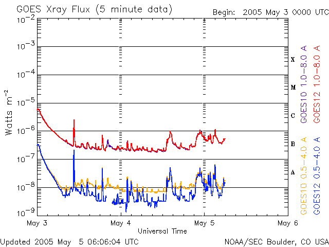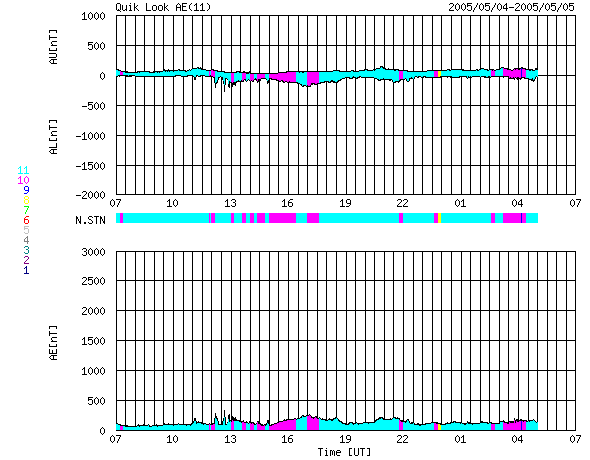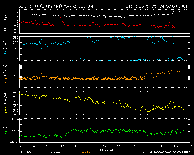 ACEが観測した太陽風の磁場(1番上の枠、白線は全体の強度、赤線は南北成分) および、太陽風の密度(3番目の橙線)、速度(4番目の黄線) (c) NOAA/SEC ![]() リアルタイムAE指数 下段のAEグラフの値が高くなると、オーロラ活動が活発化しています。 (c) 京都大学, NICT ![]() GOES衛星による、静止衛星軌道における高エネルギー電子の変化 (c) NOAA/SEC ![]() SOHO衛星のMDIカメラによる太陽黒点 (c) SOHO (ESA & NASA) ![]() GOES衛星の太陽X線データ (c) NOAA/SEC ![]() | ||||||||||||||||||||||||||||||||||||||||