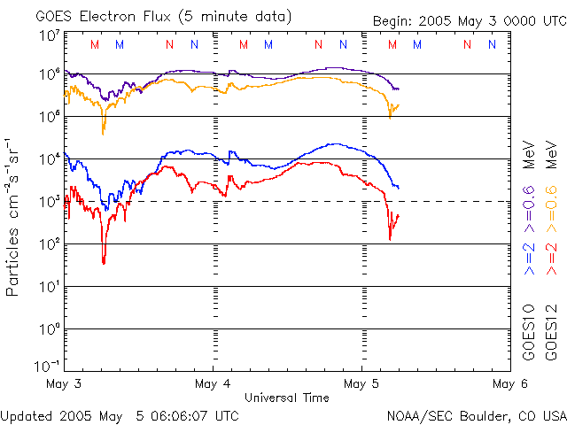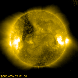 2005/ 5/ 5 15:08 更新 太陽風は穏やかで、磁気圏は静穏です。 担当 篠原 私は、昨日より大分県の久住山に来ています。 高原の鮮やかな新緑の中、九州大学の観測小屋で磁力計の設置作業を行っています。 ここは世界中に展開されている磁力計観測網のひとつで、地球の磁気圏、電離圏を監視しています。 太陽風は速度が350km/秒とやや遅くなっています。 太陽風磁場は-1〜-2nT程度の弱い南向きになっていますが、 速度が遅いこともあって地球への影響はほとんど見られません。 AE指数のグラフには小さな変化がいくらか現れている程度です。 太陽風は今後も4日間程度穏やかな状態が続くと思われます。 SOHO EIT284カメラの太陽写真を見ると、 太陽の中心から左上に黒くコロナホールが見えています。 コロナホールは太陽の磁場が外に向かって開いている場所です。 太陽風の吹き出し口になっていて、速度の高いプラズマの風が吹き出しています。 今日の写真を見ると、この領域は明日くらいに太陽の中心に達するでしょう。 コロナホールが太陽の中心線を越えると、3日後くらいに高速の太陽風が地球に到達します。 放射線帯の高エネルギー電子はやや高い状態が続いています。 GOES10衛星のみ警戒ライン(10の4乗の線)を越えています。 太陽面では、758黒点群が小さい規模ですがフレア活動を断続的に発生させています。 今後もMクラスの中規模フレアを発生させる可能性がありますので、注意が必要です。 一方、756黒点群は依然規模を保っています。 これまでフレア活動としては穏やかでしたが、昨日のX線動画では小さな活動を度々起こしている様です。 やや活動的に変わってきているのかもしれません。 こちらの黒点群の動きにも注意が必要でしょう。 SOHO衛星のEIT284カメラの映像 (c) SOHO (ESA & NASA)
