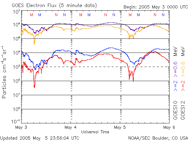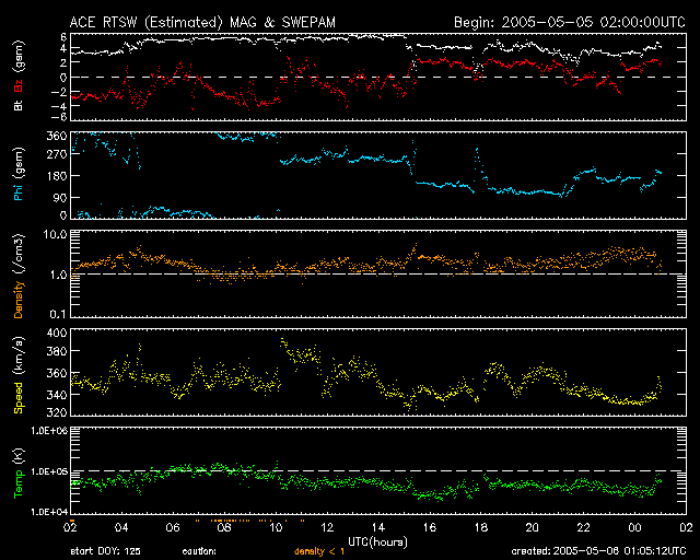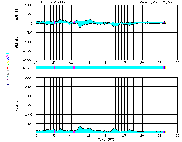 GOES衛星の太陽X線データ (c) NOAA/SEC ![]() SOHO衛星のMDIカメラによる太陽黒点 (c) SOHO (ESA & NASA) ![]() ACEが観測した太陽風の磁場(1番上の枠、白線は全体の強度、赤線は南北成分) および、太陽風の密度(3番目の橙線)、速度(4番目の黄線) (c) NOAA/SEC ![]() リアルタイムAE指数 下段のAEグラフの値が高くなると、オーロラ活動が活発化しています。 (c) 京都大学, NICT ![]() GOES衛星による、静止衛星軌道における高エネルギー電子の変化 (c) NOAA/SEC ![]() | ||||||||||||||||||||||||||||||||||||||||
