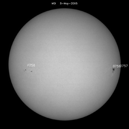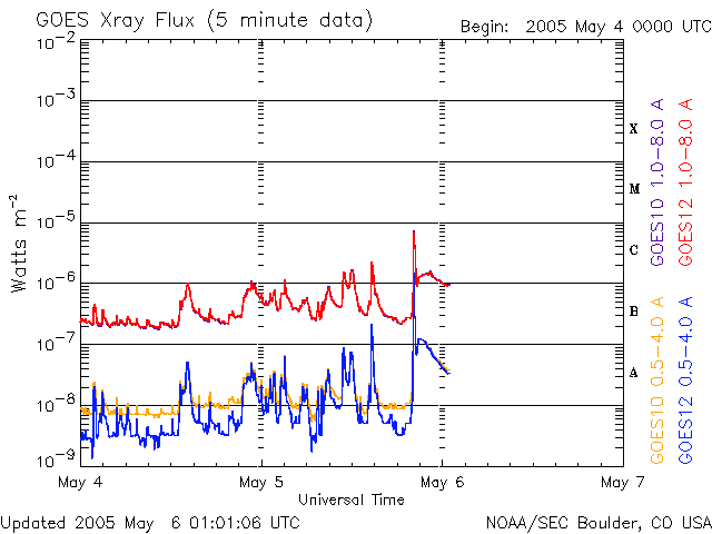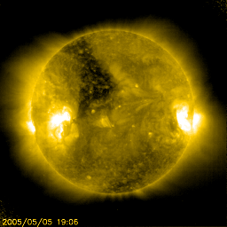 2005/ 5/ 6 10:07 更新 太陽風は速度も低く(340km/秒)、地球磁気圏は穏やかです。C7.8の小規模フレアが発生しました。 担当 篠原 今朝、6日5時(世界時5日20時)に、756黒点群がC7.8の小規模フレアを発生させました。 一瞬の閃光の様な光り方をしたフレアでした。 GOES衛星のX線グラフでは、このフレアに続いてC1程度の山が残っていますが、 これは太陽の東の縁の向こう側にある活動領域が起こしたフレアを捉えたものです。 また新しい活動的な領域がこちら側に向かってきている様です。 太陽では758黒点群も小刻みな活動を続けており、 今後も中規模フレアに対する注意が必要の様です。 太陽風は速度が340km/秒とすっかり遅くなっています。 磁場強度は5nT前後と普通の強さです。 今日のACE衛星のグラフでは、前半部分に-2nT程度の南向き成分が続いて見えています。 この影響で、AE指数にも微妙なオーロラ活動の変化が見られていますが、 速度が遅いため小さな活動しか見られません。 磁気圏はこのまま穏やかな状態がもう数日続くでしょう。 コロナホールはいよいよ太陽の中心線に達しました。 これから3〜4日後くらいで地球に速度の高い太陽風が当たるようになります。 (カウントダウンが始まるのです) コロナホールの様子から、その後3日間程度磁気圏が活動的になる日が続くと思われます。 放射線帯の高エネルギー電子は警戒ラインをやや越えるレベルが続いています。 ゆっくりと減少しますので、まだしばらく注意が必要なレベルが続きそうです。 SOHO衛星のEIT284カメラの映像 (c) SOHO (ESA & NASA)