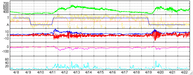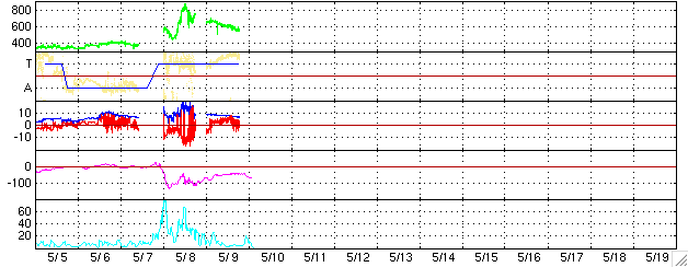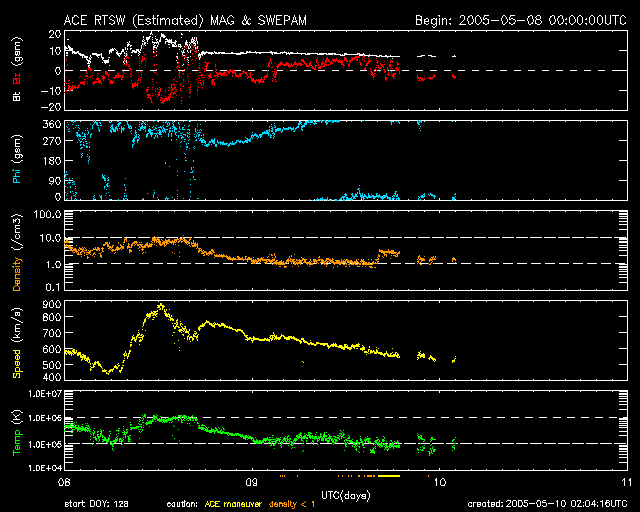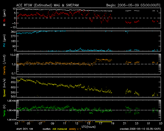 沖縄の磁場擾乱 下へ下がるほど、擾乱が発達している事を意味します。 (c) NICT ![]() リアルタイムAE指数 下段のAEグラフの値が高くなると、オーロラ活動が活発化しています。 (c) 京都大学, NICT ![]() ACEが観測した太陽風の磁場(1番上の枠、白線は全体の強度、赤線は南北成分) および、太陽風の密度(3番目の橙線)、速度(4番目の黄線) (c) NOAA/SEC ![]() 27日の太陽周期に合わせたデータプロット (太陽風版) 太陽が同じ面を地球に向けていた27日前の変化から、今後を予想することができます。 (c) NICT