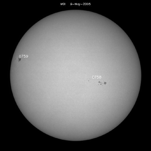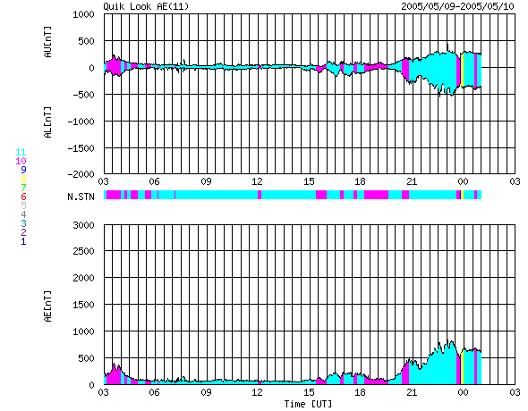 2005/ 5/10 11:39 更新 太陽風は速度も下がり、落ち着いてきました。磁気嵐も終息に向かっていますが、オーロラ活動には引き続き注意が必要です。 担当 篠原 昨日は米国SECのデータ表示システムの不調のため、太陽風データを詳しく見ることができませんでした。 今日は初めに、3日間の太陽風データの図で8-9日の変化を振り返ります。 太陽風では、2回にわたって大きな乱れが地球にやってきたようです。 白線の太陽風磁場の強度のグラフをご覧ください。 ひとつめは、8日3時(世界時7日18時)から始まる磁場強度の強まり、 ふたつめは、8日17時(世界時8日8時)から始まる磁場強度の強まりです。 どちらも、磁場の強まりに合わせて速度の上昇も発生しています。 ひとつめは約600km/秒まで、ふたつめは900km/秒まで速度が上昇しています。 これら2回の乱れにおいて、太陽風磁場が大きく南を向いていたのが、 大きな磁気嵐、活発なオーロラ活動を生んだ原因です。 -5〜-15nTのかなり大きな南向き成分がほぼ1日にわたって続いています。 ふたつめの乱れでは、太陽風の速度も一段と高かったため、かなり大きな磁気圏の擾乱が発生していました。 今回の、このふたつの太陽風の乱れでは、速度の急峻な増加という変化は見られていません。 CME(太陽ガスの放出現象)で高速ガスが地球に飛んでくる場合は、不連続な速度の急な増加がよく見られます。 しかし、今回はどちらもなだらかな(比較的短時間ではありますが)増加の曲線を描いています。 数回連続して発生したCME(太陽ガスの放出現象)活動や、コロナホールの高速風などが重なり合って、 このような変動を作り出したのかもしれません。 沖縄の磁場変化を見ると、最大で-130nTの磁場強度の減少が観測されました。 このグラフが下がるほど、磁気嵐が発達していることを示しています。 現在、赤線は-50nT近くまで回復しています。 大きな乱れの後、太陽風磁場が北を向いたために、磁気嵐は緩やかに回復に向かっていた様です。 昨日まで非常に激しかったオーロラ活動も、太陽風磁場が北を向いたことで、一旦穏やかになっています。 ただし、太陽風データの最新の部分では、-5nTの南向きに切り替わっています。 このため、オーロラ活動も現在は500nTを越える程度の活発な活動が再び始まっています。 SOHO EIR284の太陽写真に見られるように、 現在コロナホールが地球に影響を及ぼす(見かけの)位置に来ています。 このため、太陽風の速度はまだしばらく速い状態が続くでしょう。 南向き磁場の強まりに関係してオーロラ活動が活発な状態が発生します。 太陽では、758黒点群が多くのCクラス小規模フレアを発生させています。 GOES衛星のX線動画が見られないために詳細が分からないのですが、 この黒点群は活発な活動を続けているようです。 現在も、複雑な構造を保っており(エネルギーを蓄えていると考えられます)、 引き続きフレア活動に注意が必要です。 3日間の太陽風の変化。白線は磁場強度、赤線は磁場南北成分、黄色線は速度。 (c) NOAA/SEC ![]() SOHO衛星のEIT284カメラの映像 (c) SOHO (ESA & NASA)