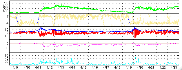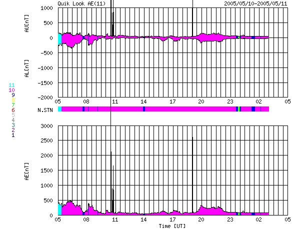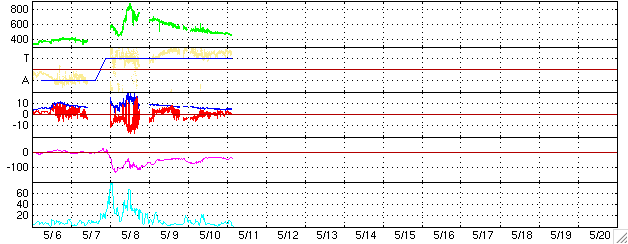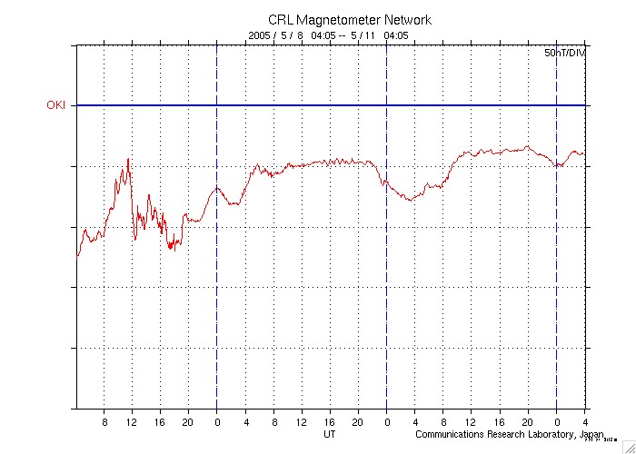 ACEが観測した太陽風の磁場(1番上の枠、白線は全体の強度、赤線は南北成分) および、太陽風の密度(3番目の橙線)、速度(4番目の黄線) (c) NOAA/SEC ![]() リアルタイムAE指数 下段のAEグラフの値が高くなると、オーロラ活動が活発化しています。 (c) 京都大学, NICT ![]() 沖縄の磁場擾乱 下へ下がるほど、擾乱が発達している事を意味します。 (c) NICT ![]() 27日の太陽周期に合わせたデータプロット (太陽風版) 太陽が同じ面を地球に向けていた27日前の変化から、今後を予想することができます。 (c) NICT