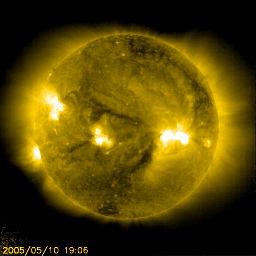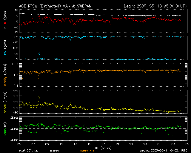 2005/ 5/11 13:08 更新 太陽風の速度は450km/秒に下がっています。オーロラ活動は穏やかになっています。 担当 篠原 太陽風の速度は順調に低下を続けています。 既に450km/秒となり、通常のレベルにほぼ戻りました。 磁場強度も5nTと普通のレベルです。 磁場の南北成分はやや北寄りになっています。 そのため、オーロラ活動はすっかり弱まっています。 AE指数のグラフでは小さな変動が見られていますが、概ね穏やかな状態です。 磁気嵐もほぼ終息しています。 沖縄の磁場変化のグラフを見ると、赤線が静穏レベル(青の横線)に-30nT程度まで近づいています。 このグラフが上に上がるほど、磁気嵐による地球周辺の擾乱の電流系が弱まってきたことを示しています。 SOHO EIT284の太陽写真を見ると、地球に高速の太陽風を送っていたコロナホールもまた、 西に(右端に)過ぎ去りつつあります。 このため、太陽風、磁気圏はともに穏やかになっていくでしょう。 一方、太陽の中心から南寄りに細い小さなコロナホールが見えています。 このコロナホールは27日前の前周期には見られないものでした(EIT284右側の写真)。 規模が小さいため地球への影響は小さいと思われますが、太陽風にどのような変化が見られるでしょうか。 これから3日後あたりに注目です。 太陽では、758黒点群が活発に活動を続けています。 昨日、10日14時(世界時10日5時)にM1.3の中規模フレアを起こしています。 その他にも、Cクラスの小規模フレアを数回発生させています。 黒点群としては規模は拡大しており、今後も中規模クラスのフレアへの注意が必要でしょう。 SOHO衛星のEIT284カメラの映像 (c) SOHO (ESA & NASA)