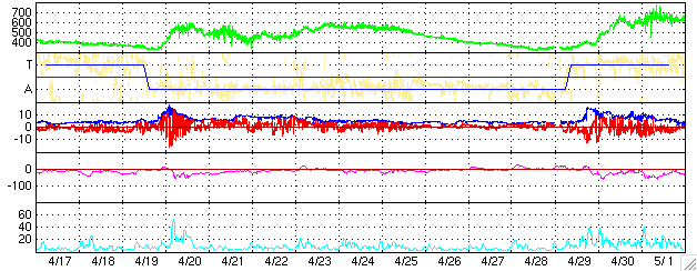 ACEが観測した太陽風の磁場(1番上の枠、白線は全体の強度、赤線は南北成分) および、太陽風の密度(3番目の橙線)、速度(4番目の黄線) (c) NOAA/SEC ![]() リアルタイムAE指数 下段のAEグラフの値が高くなると、オーロラ活動が活発化しています。 (c) 京都大学, NICT ![]() 27日の太陽周期に合わせたデータプロット (太陽風版) 太陽が同じ面を地球に向けていた27日前の変化から、今後を予想することができます。 (c) NICT