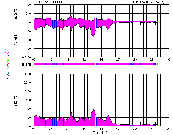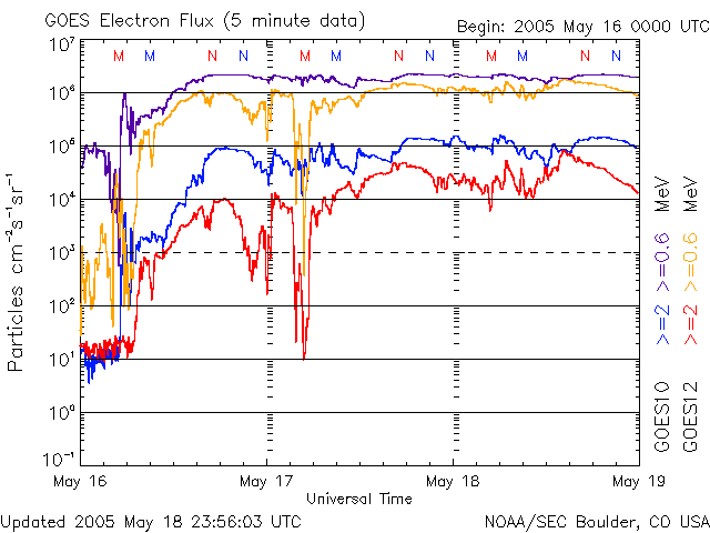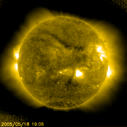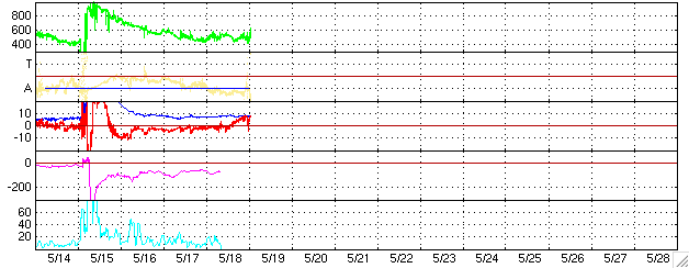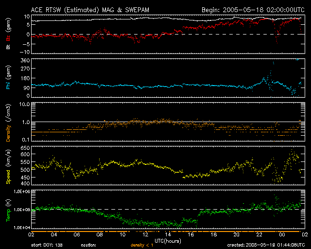 2005/ 5/19 10:43 更新 太陽風は高速ですが、磁場が北を向いたためにオーロラ活動は低下しています。今日、新しい擾乱が到来する可能性があります。 担当 篠原 ACE衛星の観測によると、太陽風は速度が450〜600km/秒の間をゆっくりと変化しながら、 高速状態を続けています。 最新の部分では、600km/秒近くにやや上がっています。 磁場強度は8nT前後とやや強めの状態で、ほとんど安定しています。 磁気圏のオーロラ活動のスイッチとなる太陽風磁場の南北成分は、 18日23時(世界時18日14時)頃までは弱いながらも南寄りになっていましたが、 それ以降北向きに切り替わっていて、現在は北向きの8nTに強まっています。 このため、ここ数日ずっと活発に続いていたオーロラ活動は弱まってしまいました。 AE指数のグラフでは、前半は500nT前後の変動が続いていますが、 後半はほとんど変動は無く、すっかり静かになっています。 ただし、これは、スイッチ(南北成分)が切れているためであって、 太陽風は現在も高速かつ強めの磁場強度を保っていて、エネルギーを十分運んでいます。 太陽風磁場が再び南向きに切り替わるとオーロラも活発に戻ります。 昨日のニュースでお知らせしましたが、 CME(太陽ガスの放出現象)による高速の太陽風のかたまりが今日あたり地球に到来する可能性があります。 CMEが小規模だったため、明確に分かるほどの太陽風の変化となるか、 現在の高速風に紛れてしまうのか分かりませんが、今夜にかけて注目してください。 特に、擾乱が強い南向き磁場をもたらすと、 磁気嵐が再び発生したり、オーロラをより活発にする可能性があります。 放射線帯の高エネルギー電子は密度がとても高まっています。 衛星の運用に対して注意が必要となる10の4乗のラインを大きく越えています。 衛星運用ではこちらに対しても注意が必要です。 太陽のフレア活動はかなり低下してきました。 GOES衛星のX線観測の背景強度も次第に下がってきていて、活動的な領域が減っていることが分かります。 今日の太陽写真では、763黒点群は見えなくなってしましました。 今後はもう大きなフレアが発生する可能性はなさそうです。 SOHO衛星のEIT284カメラの映像 (c) SOHO (ESA & NASA)
