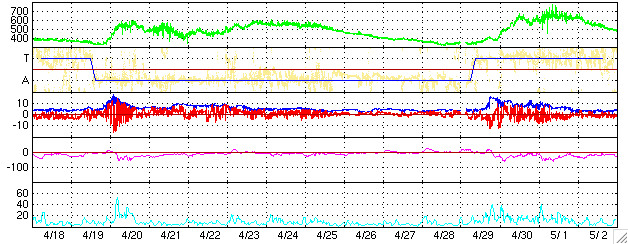 ACEが観測した太陽風の磁場(1番上の枠、白線は全体の強度、赤線は南北成分) および、太陽風の密度(3番目の橙線)、速度(4番目の黄線) (c) NOAA/SEC ![]() リアルタイムAE指数 下段のAEグラフの値が高くなると、オーロラ活動が活発化しています。 (c) 京都大学, NICT ![]() 27日の太陽周期に合わせたデータプロット (太陽風版) 太陽が同じ面を地球に向けていた27日前の変化から、今後を予想することができます。 (c) NICT
