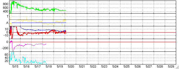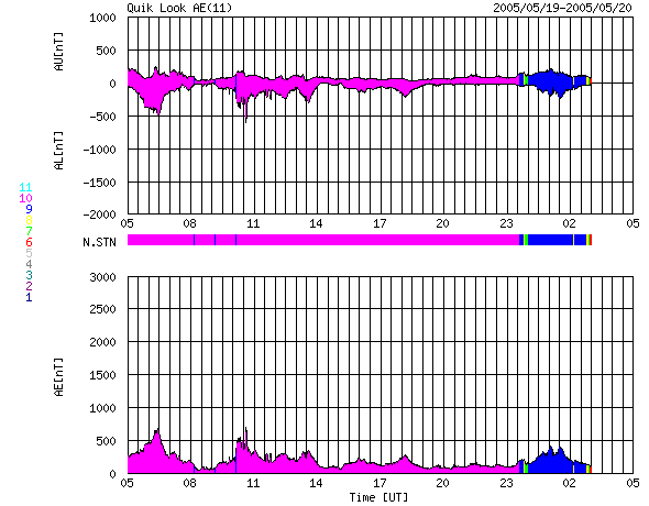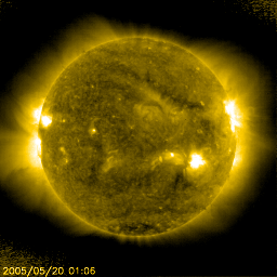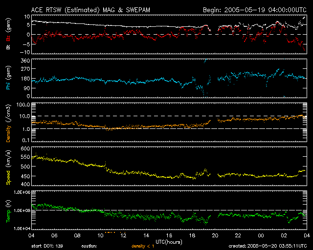 2005/ 5/20 13:04 更新 太陽風は穏やかになり、オーロラの活動レベルも下がっています。太陽の活発な活動もほぼ終わりました。 担当 篠原 太陽風の速度は450km/秒に下がっています。 磁場強度は5nT弱で、太陽風はほぼ通常レベルに戻ったと考えて良さそうです。 昨日辺りに、CME(太陽ガスの放出現象)によって飛ばされた高速の太陽風が 地球にやってくるかもしれないと記していましたが、 これまでのところ目立った変化は観測されていません。 しかし、今日いっぱいは小規模な乱れが発生する可能性が残っています。 太陽から地球に来るまでに時間がかかっていますので、 もし乱れが発生しても大きくなることはないでしょう。 ACEのデータの太陽風密度(ACEデータの橙色線)のグラフが高くなっていて、 太陽風の密度が濃くなっています。 多発したCMEなどの影響によるものかもしれません。 速度や磁場に変化が無ければ、密度の増加が地球磁気圏へ及ぼす影響はほとんどありません。 この後は数日間にわたって、太陽風も磁気圏も穏やかな日が続くでしょう。 放射線帯の高エネルギー電子は現在も高いレベルが続いています。 磁気圏が穏やかになると、電子密度の減少はとてもゆっくりになります。 数日間の時間幅で警戒レベルが続きますので注意してください。 太陽のフレア活動はすっかり穏やかになりました。 X線レベルの背景強度も下がり、フレアの変化も見られなくなっています。 太陽面では759黒点群が西端に没しつつあります。 このあとは、無黒点状態になりそうです。 SOHO衛星のEIT284カメラの映像 (c) SOHO (ESA & NASA)