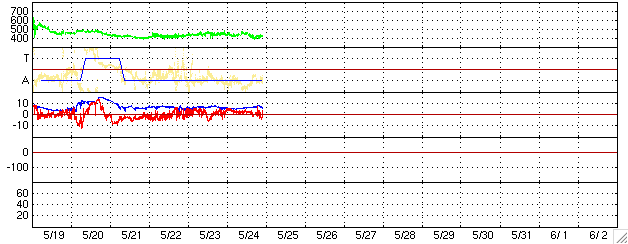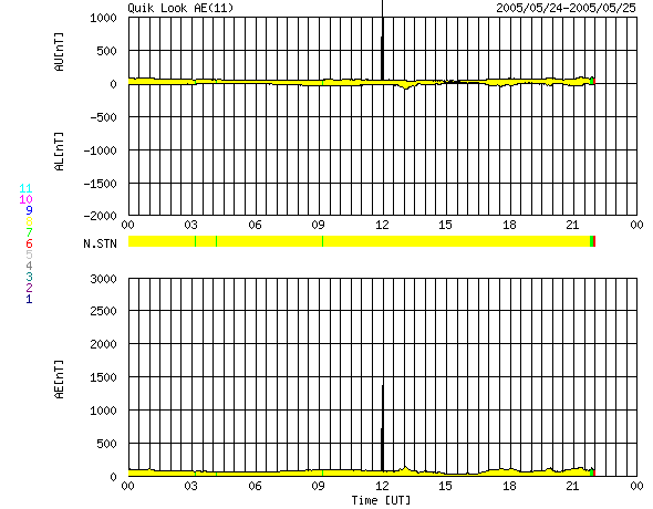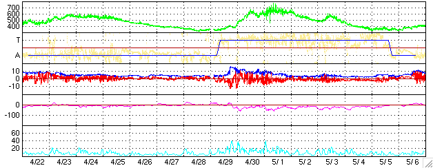 ACEが観測した太陽風の磁場(1番上の枠、白線は全体の強度、赤線は南北成分) および、太陽風の密度(3番目の橙線)、速度(4番目の黄線) (c) NOAA/SEC ![]() リアルタイムAE指数 下段のAEグラフの値が高くなると、オーロラ活動が活発化しています。 (c) 京都大学, NICT ![]() 27日の太陽周期に合わせたデータプロット (太陽風版) 太陽が同じ面を地球に向けていた27日前の変化から、今後を予想することができます。 (c) NICT
