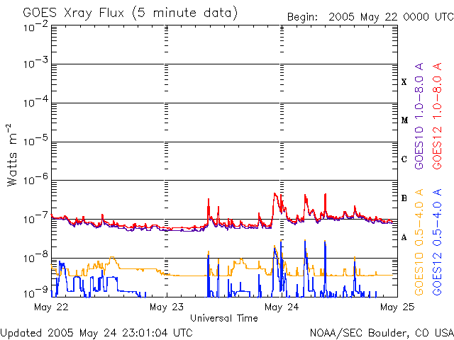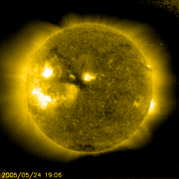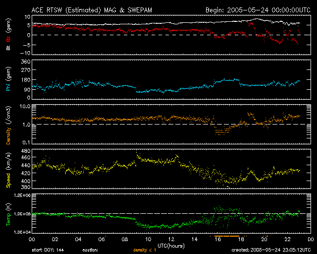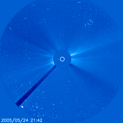 2005/ 5/25 08:06 更新 現在、太陽風は穏やかです。明日以降、コロナホールの影響を受けるかもしれません。太陽も穏やかです。 担当 篠原 今日1枚目の写真は、SOHO衛星のLASCO C3カメラが撮影したプレアデス星団(すばる)の様子です。 写真中心に太陽の位置を示す白丸が見えますが、その右上に星のかたまりがあります。 これは「すばる」の名前で知られるプレアデス星団です。 LASCO C3カメラは太陽から吹き出しているガスの様子を捉えるためのカメラですが、 広い視野で白色光を撮影しているため、見慣れた星が姿を現す事が度々あります。 毎年この時期になると、プレアデス星団が視野に入ってきます。 宇宙天気とは関係ありませんが、私にとって春の風物詩です。 太陽風は基本的に穏やかです。 速度は420km/秒と通常の速度です。 磁場強度は6nT前後で、いくぶん強めな印象ですが、 北寄りの傾向が続いていたため、地球磁気圏への影響はほとんどありませんでした。 オーロラの活動度を示すAE指数のグラフには変化が全く見られていません。 ACEのグラフの最後の部分では磁場の南北成分(赤線)が乱れ、南向き磁場が見られています。 これから、オーロラ活動にいくらか影響を及ぼすかもしれません。 ただ、速度が普通のレベルですので、大きな活動になることはないでしょう。 27日周期の図を見ると、今日いっぱいは太陽風は穏やかな状態が続きそうです。 明日の午後以降、太陽風磁場のセクター境界がやってきそうです。 前周期では、それに続いてコロナホールによる高速の太陽風がやってきています。 SOHO EIT284の太陽写真を見ると、太陽の中心から左上にかけて、細長くコロナホールが見えています。 このコロナホールは前周期(4月27日)と比べるとずいぶん小さくなっています。 従って、地球への影響も小さくなっている可能性があります。 このような、コロナホールの長期的変化を見たいときには、 こちらのコロナホールカレンダーが便利です。 太陽のフレア活動は、穏やかな状態が続いています。 黒点群は2つ見えています。 このうち、767黒点群が磁場構造が複雑になってきているそうで、活動を強めるかもしれません。 Cクラスの小規模フレア発生の可能性があるとSECが伝えています。 SOHO衛星LASCO C3カメラの視野を横切る、プレアデス星団(すばる)。画面の右上の星のかたまりです。 (c) ESA & NASA ![]() SOHO衛星のEIT284カメラの映像 (c) SOHO (ESA & NASA)