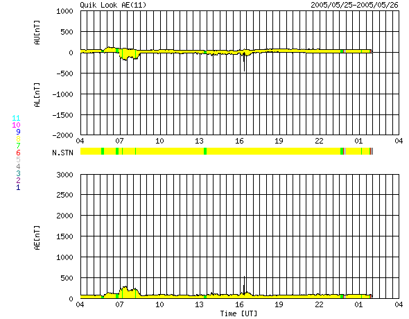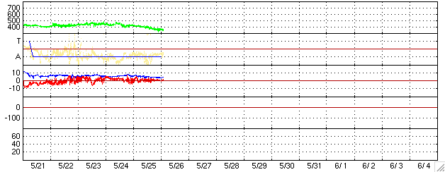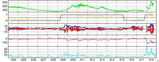 ACEが観測した太陽風の磁場(1番上の枠、白線は全体の強度、赤線は南北成分) および、太陽風の密度(3番目の橙線)、速度(4番目の黄線) (c) NOAA/SEC ![]() リアルタイムAE指数 下段のAEグラフの値が高くなると、オーロラ活動が活発化しています。 (c) 京都大学, NICT ![]() 27日の太陽周期に合わせたデータプロット (太陽風版) 太陽が同じ面を地球に向けていた27日前の変化から、今後を予想することができます。 (c) NICT