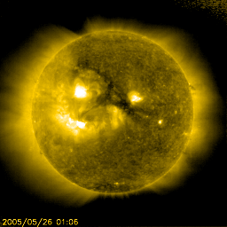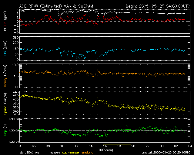 2005/ 5/26 12:25 更新 太陽風、磁気圏ともに静穏です。明日くらいから、太陽風にコロナホールの影響が見られる可能性があります。 担当 篠原 太陽風はとても穏やかです。 速度は400km/秒から350km/秒へ一段と下がっています。 磁場強度は4nTと普通ですが、やや北寄りの傾向を持っており、 速度が低い事と重なって磁気圏への影響はとても小さいものとなっています。 オーロラの活動度を示すAE指数のグラフを見ると、ほとんど変化が発生していません。 わずかに25日16時(世界時25日7時)頃に、小規模なふくらみが見えていますが、 太陽風の変化を見ると、この少し前の時刻に-2nT程度と小さいですが 磁場が2時間ほど南を向いていたことが分かります。 太陽風磁場の南向きで磁気圏にエネルギーが流れ込む(オーロラ活動を高める)という反応がよく分かります。 今後の展開ですが、SOHO EIT284カメラの太陽写真を見ると、 コロナホールが太陽の中心を過ぎて見えています。 今後、ここから吹き出している高速の太陽風の影響が地球に及ぶでしょう。 27日周期の図から前周期の変化を見ると(4月30日に速度が上がっています)、 明日の27日くらいから高速風がやってくる可能性があります。 前回は700km/秒まで速度が上がりました。 今回はコロナホールの規模が小さくなっている様ですので、影響も小さくなるかもしれません。 今後の変化に注目です。 また、前周期のセクターの変化を見ると、今日か明日くらいにセクター境界もやってきそうです。 太陽風磁場のおおまかな向きが、「太陽→地球」方向から、「地球→太陽」方向に切り替わります。 そのこと自体は大きな影響はありませんが、太陽風の周期的な変化を見る上で良い指標になります。 太陽では、767黒点群がやや発達しており、 Cクラスの小規模フレアを起こす可能性があるとのことです。 SOHO衛星のEIT284カメラの映像 (c) SOHO (ESA & NASA)