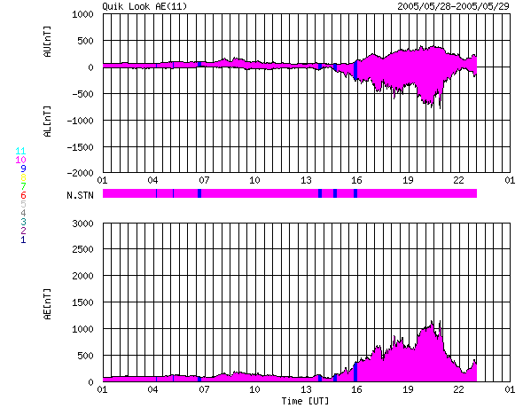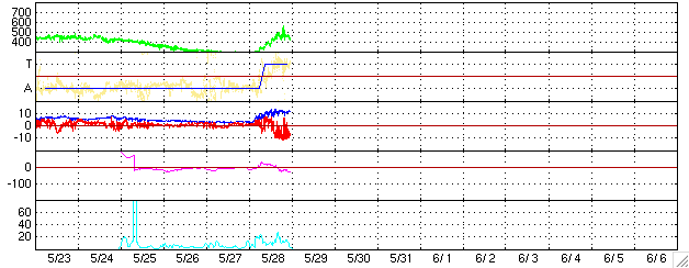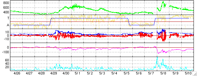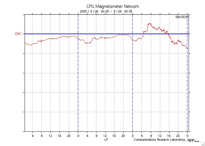ACEが観測した太陽風の磁場(1番上の枠、白線は全体の強度、赤線は南北成分) および、太陽風の密度(3番目の橙線)、速度(4番目の黄線) (c) NOAA/SEC ![]() リアルタイムAE指数 下段のAEグラフの値が高くなると、オーロラ活動が活発化しています。 (c) 京都大学, NICT ![]() 沖縄の磁場擾乱 下へ下がるほど、擾乱が発達している事を意味します。 (c) NICT ![]() 27日の太陽周期に合わせたデータプロット (太陽風版) 太陽が同じ面を地球に向けていた27日前の変化から、今後を予想することができます。 (c) NICT