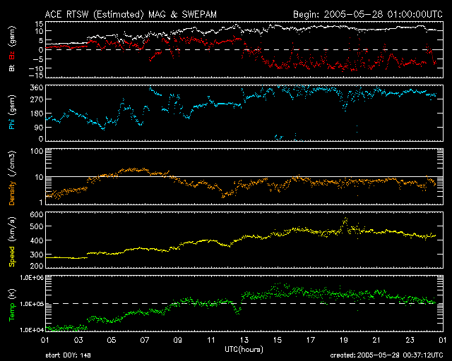 2005/ 5/29 09:39 更新 太陽風の磁場が大きく南を向いています。小規模の磁気嵐に発達しそうです。 担当 篠原 28日12時半(世界時28日3時半)から太陽風に変化が起こっています。 磁場強度が7nTに強まり、その後更に12nTにまで強まっています。 速度も初めは280km/秒から300km/秒くらいにわずかに増加しただけですが、 その後緩やかに上昇し、450km/秒まで上がっています(ただし、やや速いという程度です)。 磁場データを見ると、この時刻に太陽風磁場のセクター境界を越えています。 コロナホールの影響と重なって太陽風の様子が変わった様です。 重要な変化はその後、28日22時(世界時28日13時)の、太陽風磁場の南北成分(ACEの赤線)の変化です。 それまで北寄りだった磁場が南向きに反転し、-10nT程度の大きな南向き磁場を運ぶようになりました。 このため地球の磁気圏にエネルギーが流れ込みやすくなり、磁気圏を活動的にしています。 AE指数のグラフでは1000nT近い変動が発生しています。 沖縄の磁場データを見ると、静穏レベル(青の横線)からグラフが下がり始めています (磁気嵐が発達すると、このグラフが下がっていきます)。 太陽風の速度がそれほど高くないので、大きな乱れにはならないでしょうが、 小規模の磁気嵐には発達しそうです。 この太陽風の変化は、コロナホールや26日のCME(太陽ガスの放出現象)などが 重なりあって起きている現象だと思われます。 太陽風磁場の大きな南向きが続いている間は磁気圏の乱れも続きます。 SOHO EIT284の太陽写真では、現在地球に影響を及ぼしているコロナホールが北西部(右上)に見えています。 一方、中心の南側(下側)にももうひとつコロナホールが見えている様です。 これは前周期までははっきりとは見えていなかったものです。 地球に影響があるとすると、3日後くらいに始まります。注目したいところです。 太陽では767黒点群が現在も勢力を保っています。 フレア活動そのものはやや収まってますが、規模がありますので、 今後も中規模フレアに対する注意が必要の様です。 SOHO衛星のEIT284カメラの映像 (c) SOHO (ESA & NASA)