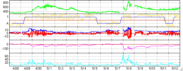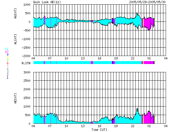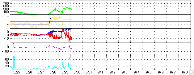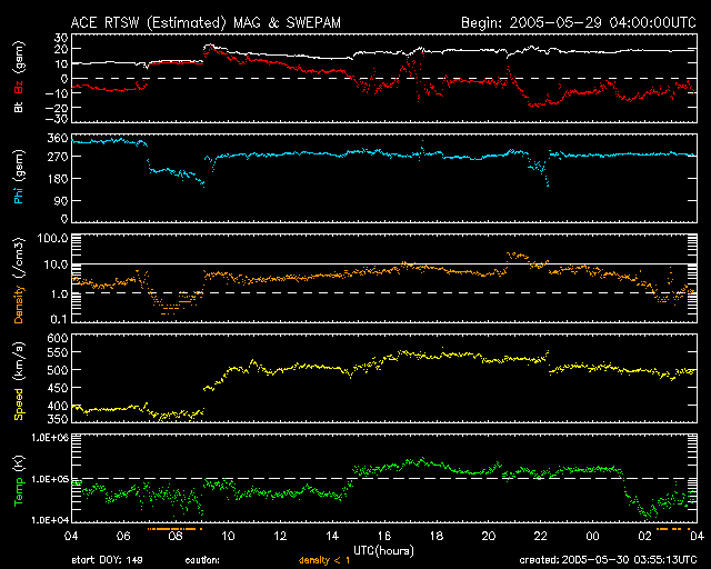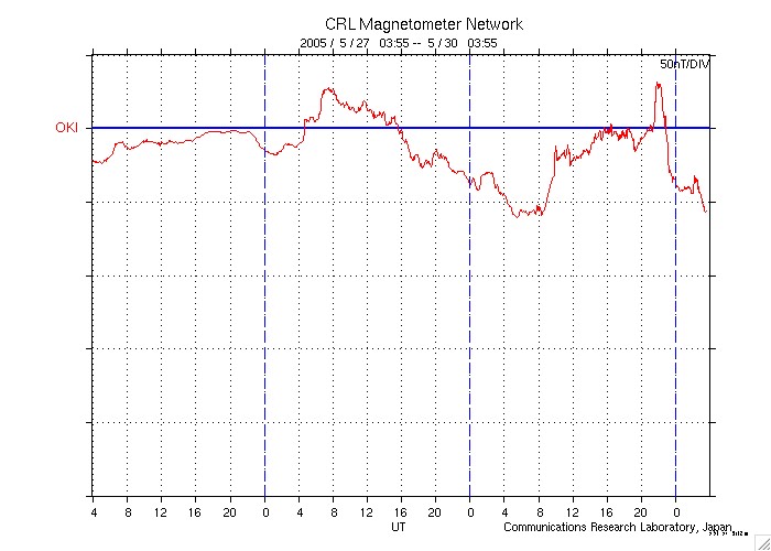 ACEが観測した太陽風の磁場(1番上の枠、白線は全体の強度、赤線は南北成分) および、太陽風の密度(3番目の橙線)、速度(4番目の黄線) (c) NOAA/SEC ![]() リアルタイムAE指数 下段のAEグラフの値が高くなると、オーロラ活動が活発化しています。 (c) 京都大学, NICT ![]() 沖縄の磁場擾乱 下へ下がるほど、擾乱が発達している事を意味します。 (c) NICT ![]() 27日の太陽周期に合わせたデータプロット (太陽風版) 太陽が同じ面を地球に向けていた27日前の変化から、今後を予想することができます。 (c) NICT