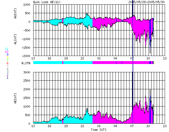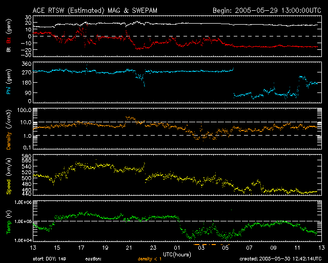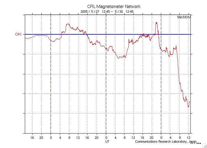 2005/ 5/30 21:44 更新 太陽風磁場の強い南向き(-15nT)が続いています。このため、磁気嵐が発達を続けています。 担当 篠原 太陽風磁場が-15nTの強い南向きを続けています。 昼のニュース執筆時は南向き磁場が終わりそうな気配もあったのですが、 30日14時(世界時30日5時)から再び南向き傾向を強め、 その後8時間近くほとんど一様に-15nTの南向きが続いています。 太陽風の速度は450km/秒と通常よりやや速めという程度なのですが、 これだけの南向きが続くと磁気圏もかなり活発に活動しています。 AE指数では1000nTを中心に、時として1500〜2000nTに達する激しいオーロラ活動を観測しています。 沖縄の磁場データは、30日16時(世界時30日7時)頃から急激にレベルを下げ、 現在は静穏レベル(青の横線)から180nT近く下がっています。 京都大学のDst指数の速報値でも-100nTに達しており、磁気嵐が発達を続けているようです。 太陽風磁場の強い南向きがこの様に長時間継続するとは予想していませんでした。 今後もこの状態が続く間は磁気圏は活発に活動を続けるでしょう。 今後の太陽風磁場の変化に注目してください。 ACEが観測した太陽風の磁場(1番上の枠、白線は全体の強度、赤線は南北成分) および、太陽風の密度(3番目の橙線)、速度(4番目の黄線) (c) NOAA/SEC ![]() リアルタイムAE指数 下段のAEグラフの値が高くなると、オーロラ活動が活発化しています。 (c) 京都大学, NICT ![]() 沖縄の磁場擾乱 下へ下がるほど、擾乱が発達している事を意味します。 (c) NICT ![]() | |||||||||||||||||||||||||||||||||||||||