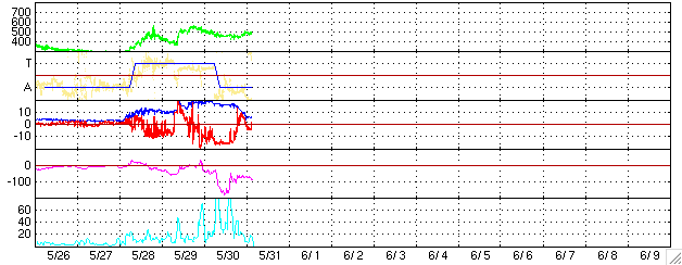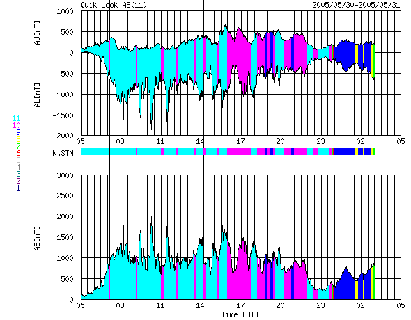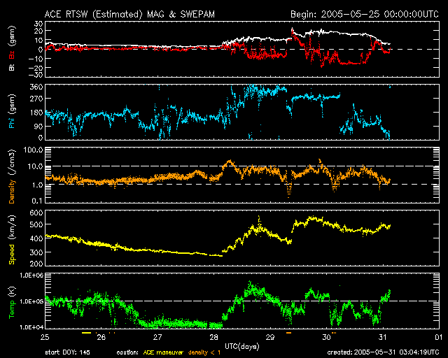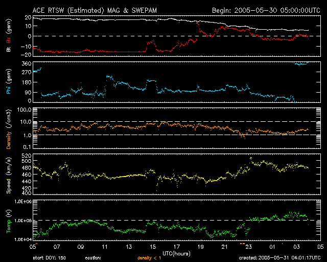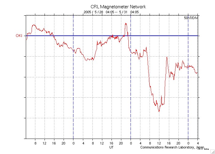 2005/ 5/31 13:03 更新 太陽風磁場が大きく南を向いたため、磁気嵐が発達しました。現在は、終息に向かっています。 担当 篠原 30日14時(世界時30日5時)から始まった、-15nTに達する太陽風磁場の強い南向きのため、 磁気圏が大きく乱れ、磁気嵐が発生しました。 強い南向きは31日3時(世界時30日18時)頃まで、半日にわたって続きました。 速度は450km/秒とやや速い程度でしたので、極端に激しい磁気圏擾乱にはなりませんでしたが、 速度が更に速かった場合は、かなり大規模な乱れになったことでしょう。 それでも、磁気圏は大きく乱れています。 AE指数では1000〜1500nTに達する激しいオーロラ活動が連続的に発生しています。 沖縄の磁場データは、静穏レベル(青の横線)から最大で-180nTも下がっています。 これは磁気嵐の発達を示唆していますが、 沖縄の一カ所のデータだけでは地球全体の正確な様子は分かりません。 京都大学のDst指数速報値を見ると、 磁気嵐の発達は-105nTに達していたようです(これは普通の規模の磁気嵐です)。 これらの磁場強度の低下は、地球を取り囲む様に流れる電流系の影響です(環電流と呼びます)。 この電流系の発達が磁気嵐の指標になっているのですが、 この電流系には、場所によって強く流れる部分や、弱く流れる部分などむらがあります。 そのため、沖縄の一カ所のデータだけを見ていても、 地球全体の乱れの正確な様子をとらえることはできないのです。 NICTの観測データを見てみると、沖縄磁場が大きく減少したのに対して、 地球の裏側のブラジルの磁場データはそこまで大きく減少はしていませんでした。 沖縄は電流の強い地域に、ブラジルは電流の弱い地域に当たっていたのでしょう。 太陽風の乱れは収まりつつあります。 磁気圏の乱れも、次第に収まるでしょう。 このまま地球磁気圏は一旦静かになりそうですが、 明日以降、今度はコロナホールの影響で乱れが発生するかもしれません。 コロナホール自体は小規模ですので、大きな乱れにはならないでしょう。 太陽のフレア活動はすっかり穏やかになっています。 767黒点群も現在は穏やかになっています。 1週間の太陽風の変化。今回の変動の全体を見ることができます。非常に長い時間、太陽風磁場の強い南向きが発生しました。 (c) NOAA/SEC ![]() ACEが観測した太陽風の磁場(1番上の枠、白線は全体の強度、赤線は南北成分) および、太陽風の密度(3番目の橙線)、速度(4番目の黄線) (c) NOAA/SEC ![]() リアルタイムAE指数 下段のAEグラフの値が高くなると、オーロラ活動が活発化しています。 (c) 京都大学, NICT ![]() 沖縄の磁場擾乱 下へ下がるほど、擾乱が発達している事を意味します。 (c) NICT ![]() 27日の太陽周期に合わせたデータプロット (太陽風版) 太陽が同じ面を地球に向けていた27日前の変化から、今後を予想することができます。 (c) NICT