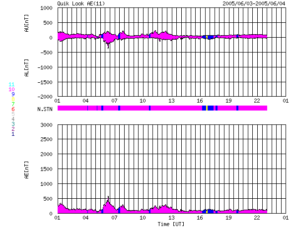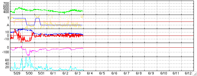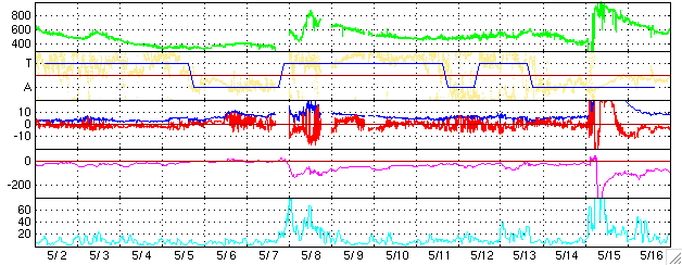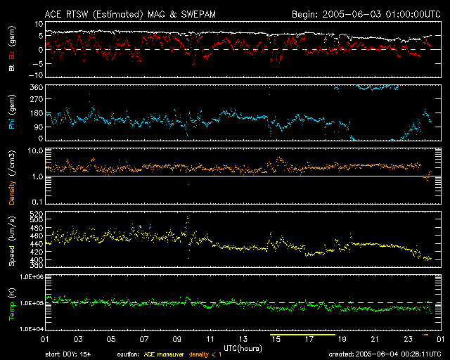 GOES衛星の太陽X線データ (c) NOAA/SEC ![]() SOHO衛星のMDIカメラによる太陽黒点 (c) SOHO (ESA & NASA) ![]() ACEが観測した太陽風の磁場(1番上の枠、白線は全体の強度、赤線は南北成分) および、太陽風の密度(3番目の橙線)、速度(4番目の黄線) (c) NOAA/SEC ![]() リアルタイムAE指数 下段のAEグラフの値が高くなると、オーロラ活動が活発化しています。 (c) 京都大学, NICT ![]() 27日の太陽周期に合わせたデータプロット (太陽風版) 太陽が同じ面を地球に向けていた27日前の変化から、今後を予想することができます。 (c) NICT