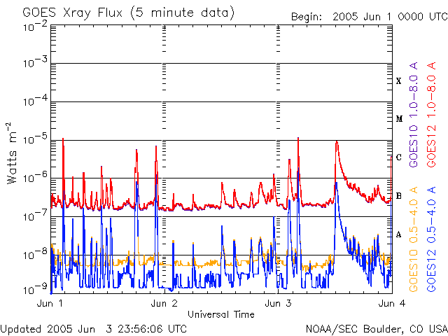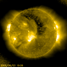 2005/ 6/ 4 09:30 更新 太陽風、磁気圏は静穏です。太陽から横方向にCMEが発生しています。 担当 篠原 3日21時(世界時3日12時)にM1.0のフレアが太陽の東端(左端)で発生しました。 発生源は、太陽の向こう側の活動領域です(フレアの本当の規模はもっと大きかったと思われます)。 これに伴って、CME(太陽ガスの放出現象)が発生しています。 SOHO LASCO C3の写真を見ると、太陽の東側(左側)に向かって大規模なガスの放出が起こっています。 地球から見て真横の現象ですので、影響はほとんどないでしょう。 その他にも、M1.3の中規模フレア、C3.1の小規模フレアなどが772黒点群で発生しています。 この群は引き続き、小規模から中規模のフレアを発生させる可能性があるそうです。 太陽風は速度が450km/秒から420km/秒へやや下げています。 7nTにやや上がっていた磁場強度も、4nTへ下がっています。 基本的に静穏な状態で、磁気圏も穏やかになっています。 一方、コロナホールから吹き出した高速の太陽風が、いよいよ地球に影響を及ぼしそうです。 明日くらいから太陽風の速度が上昇を始めるのではないでしょうか。 SOHO EIT284の太陽写真ではコロナホールの先頭が、影響が始まる目安の位置、 すなわち太陽の中心線と西端との中間点に達しつつあります。 注意してほしいのは、これはあくまでも見かけ上の位置であって、 地球に届く高速太陽風はコロナホールが太陽の中心にあるときに吹き出していたガスです。 ガスが地球に届くまでに3日もかかるために起こる、見かけのずれです。 (空を飛ぶ飛行機の位置と、聞こえてくる音の方向がずれているのと同じ仕組みです) SOHO衛星のEIT284カメラの映像 (c) SOHO (ESA & NASA)