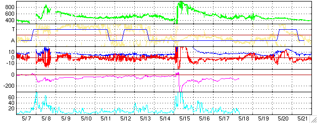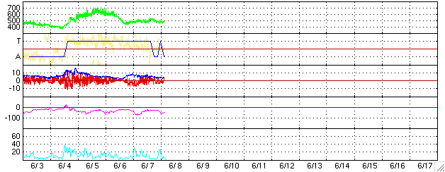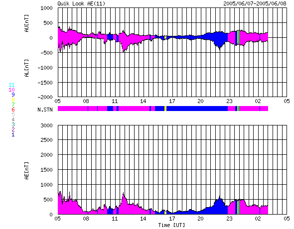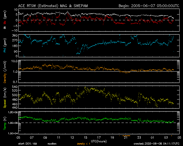 2005/ 6/ 8 13:13 更新 太陽風はやや高速状態で、オーロラ活動も続いています。太陽の黒点群が発達しています。 担当 篠原 太陽風は450〜500km/秒とやや高速の状態を続けています。 磁場強度は5nTと普通の強さです。 磁場の南北成分を見ると、南北にゆらゆらと振動している様子が見られます。 このため、地球磁気圏のオーロラ活動に刺激を与え続けています。 AE指数のグラフを見ると、500nT前後のオーロラ活動がたびたび観測されています。 速度があまり高くないため、激しい活動には至っていませんが、 太陽風から磁気圏にエネルギーが流れ続けているようです。 SOHO衛星のEIT284カメラが休止状態になっています。 当面は目立ったコロナホールもなく、現在のような規模の活動は見られても、 基本的に穏やかな宇宙天気が続きそうです。 ただし、これは太陽活動が穏やかな状態を続けた場合です。 太陽面には現在775、776などの黒点群が規模を拡大しつつあり、 目立って来ています。 今も、小さなCクラスの小規模フレアをたびたび起こしており、 今後中規模フレアを発生させる可能性があります。 黒点群は更に発達する可能性もありますので、しばらく注目する必要があります。 GOES衛星の観測によると、放射線帯の高エネルギー電子は密度を下げており、 警戒ラインを割っています。 ACEが観測した太陽風の磁場(1番上の枠、白線は全体の強度、赤線は南北成分) および、太陽風の密度(3番目の橙線)、速度(4番目の黄線) (c) NOAA/SEC ![]() リアルタイムAE指数 下段のAEグラフの値が高くなると、オーロラ活動が活発化しています。 (c) 京都大学, NICT ![]() 27日の太陽周期に合わせたデータプロット (太陽風版) 太陽が同じ面を地球に向けていた27日前の変化から、今後を予想することができます。 (c) NICT