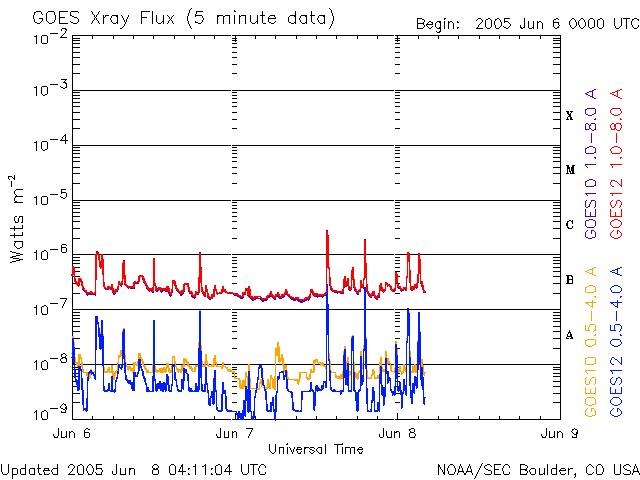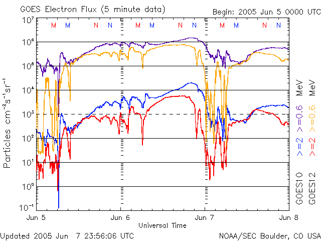 (c) SOHO (ESA & NASA) ![]() GOES衛星の太陽X線データ (c) NOAA/SEC ![]() GOES衛星による、静止衛星軌道における高エネルギー電子の変化 (c) NOAA/SEC ![]() | |||||||||||||||||||||||||||||||||||||||||||||||||||||||