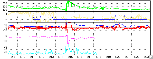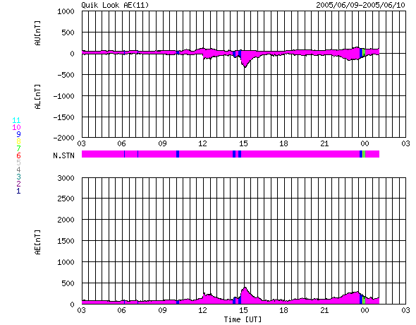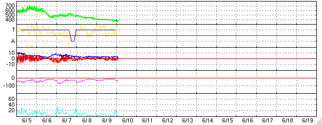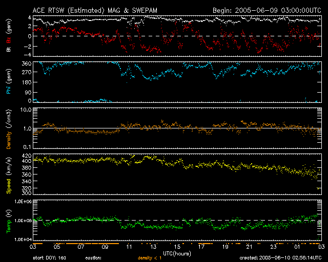 2005/ 6/10 11:59 更新 太陽風は低速になっています(350km/秒)。磁気圏は穏やかです。775、776黒点群が太陽の中心に近づいています。 担当 篠原 宇宙天気は穏やかな状態が続いています。 太陽風は一段と速度を下げ、350km/秒に下がっています。 磁場強度は3nT前後。 9日19時(世界時9日10時)ころから太陽風磁場が南寄りの傾向を強めています。 しかし、速度が下がっていることと、磁場強度そのものが弱いため、 磁気圏のオーロラ活動を活発化するには至っていません。 AE指数では300nT程度の小規模の活動がいくつか見えている程度です。 このまま穏やかな状態がしばらく続きそうです。 太陽では、775、776の大きな黒点群が、太陽の中心に達しつつあります。 写真を見ても、かなり目立っています。 ただ、ここへ来てフレアの活動は低下させていて、 昨日以降では、776群がC1の小規模フレアを起こしただけです。 黒点群の規模から考えて、中小規模のフレアを起こす可能性はありそうです。 引き続き注意は必要でしょう。 ACEが観測した太陽風の磁場(1番上の枠、白線は全体の強度、赤線は南北成分) および、太陽風の密度(3番目の橙線)、速度(4番目の黄線) (c) NOAA/SEC ![]() リアルタイムAE指数 下段のAEグラフの値が高くなると、オーロラ活動が活発化しています。 (c) 京都大学, NICT ![]() 27日の太陽周期に合わせたデータプロット (太陽風版) 太陽が同じ面を地球に向けていた27日前の変化から、今後を予想することができます。 (c) NICT