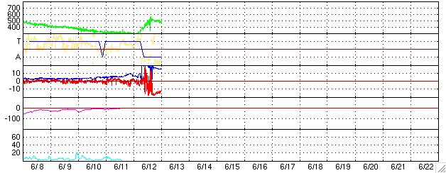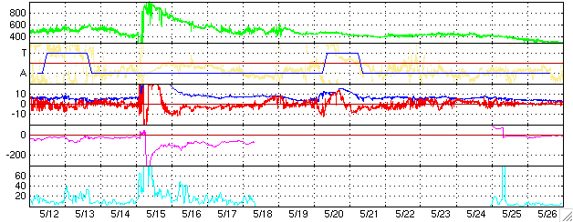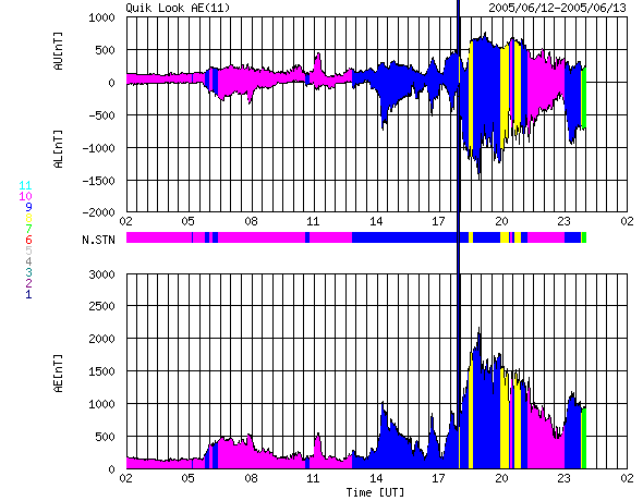 ACEが観測した太陽風の磁場(1番上の枠、白線は全体の強度、赤線は南北成分) および、太陽風の密度(3番目の橙線)、速度(4番目の黄線) (c) NOAA/SEC ![]() リアルタイムAE指数 下段のAEグラフの値が高くなると、オーロラ活動が活発化しています。 (c) 京都大学, NICT ![]() 27日の太陽周期に合わせたデータプロット (太陽風版) 太陽が同じ面を地球に向けていた27日前の変化から、今後を予想することができます。 (c) NICT