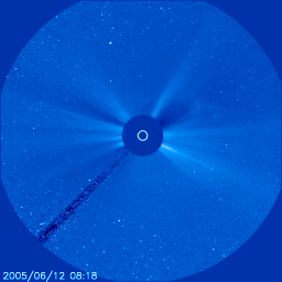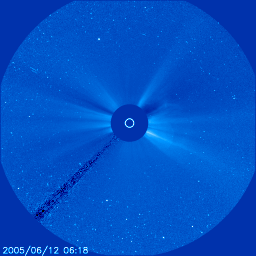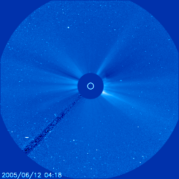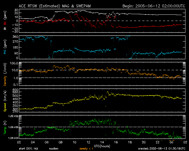 2005/ 6/13 10:32 更新 太陽風が乱れ、磁気嵐が発達しています。また、明日の午後以降にも太陽風が乱れそうです。 担当 篠原 12日16時(世界時12時7時)頃から、太陽風が大きく乱れました。 最も激しく乱れているのは磁場です。 強度が25nTに一気に強まり、現在も15nTの強さを保っています。 太陽風の速度は400km/秒に小さく上がり、その後緩やかに上昇して、 13日0時(世界時12日15時)頃に500km/秒に達しました。 ただし、この速度はやや高速という程度で、大きな乱れではありません。 磁気圏擾乱に大きく影響を持つ太陽風磁場の南北成分は、 擾乱開始直後はほぼ0になっていて、南北どちらでもない状態でした。 しかし、次第に南寄りに乱れ始め、13日1時(世界時12日16時)頃から安定して強い南向きになっています。 初めに-18nTもの強い南向きになり、その後緩やかに弱まっていますが、現在も-10nTを保っています。 この影響で、磁気圏は大きく乱れました。 AE指数では最大2000nTに達する非常に激しい擾乱が発生しています。 擾乱は13日2時(世界時12日17時)頃から大きく発達しており、安定した南向きの影響が大きかったのでしょう。 Dst指数の速報値でも-100nTの変化が観測されていて、磁気嵐が発達しています。 今回は、磁場は強かったものの、速度はそれほど高速ではなかったので、 ある意味、この程度の乱れで済んでいるという言い方もできそうです。 この太陽風の乱れの原因ですが、 ひとつ考えられるのが、9日21時(世界時9日12時)頃から始まっている、C1の小規模フレアです。 この後のLASCO C3カメラの画像を見ると、とてもかすかですがCME(太陽ガスの放出現象)が見えています。 地球への到達までに約3日かかっており、速度が500km/秒程度だったこととあわせると、 このCMEが原因である可能性が高いと思います。 ACEのデータを見ると、太陽風磁場の南向き成分は緩やかに減少を続けています。 この調子では、あと半日程度で南向きが終わるのではないでしょうか。 南向きの強度が下がっていますので、磁気圏の乱れも次第に小規模になるでしょう。 南向きが終われば、磁気圏も静穏に戻ります。 さて、太陽では、775黒点群がふたたびCMEをともなうフレアを2回発生させています。 12日11時(世界時12日2時)のC3.5と、13日0時(世界時12日15時)のC3.0の小規模フレアです。 どちらも発生時間の長いタイプのフレアで、SOHO衛星のLASCO C3カメラの画像を見ると、 CME(太陽ガスの放出現象)が見えています(かすかで分かりにくいですが、写真を3枚掲載しています)。 この影響が明日の午後から明後日にかけて、地球に及ぶと予想されます。 再び、太陽風が乱れ、磁気圏が活動的になるでしょう。 SOHO衛星のLASCO C3カメラの映像 (c) SOHO (ESA & NASA)
