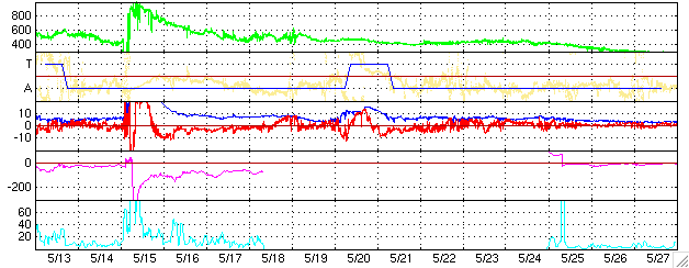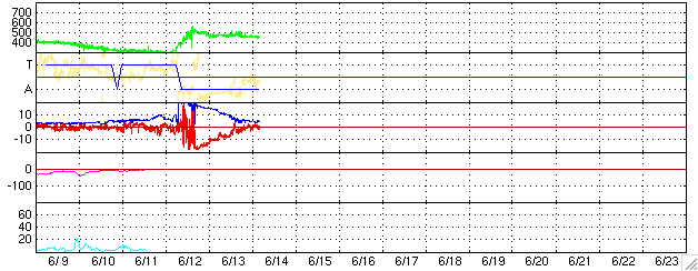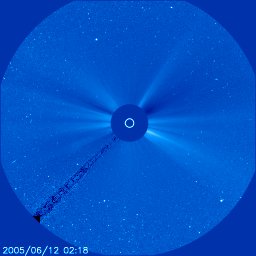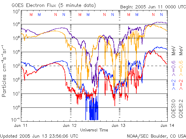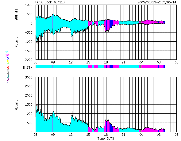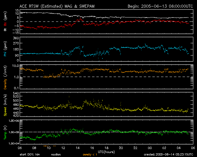 2005/ 6/14 14:25 更新 太陽風磁場の強い南向きは終わり、磁気圏は静穏に戻っています。これから明日にかけて次の乱れが到来するでしょう。 担当 篠原 太陽風の強い南向き磁場の影響で磁気嵐が発生していましたが、 南向き磁場は次第に強度を下げ、 14日4時(世界時13日19時)頃には南向きもほぼ終わって、磁気圏は静穏に戻っています。 それまで、オーロラの活動度を示すAE指数で1000nTに達する活動が続いていましたが、 南向きが消えた後は、すっかり変化もなくなっています。 現在の太陽風は、速度450km/秒、磁場強度5nT、南北成分はほぼ0nTとなっており、 通常の状態に戻っています。 Dst指数(京都大学)のグラフを見ると、磁気嵐は-100nT程度まで発達しましたが、 既にかなり回復しています。 今回の擾乱に伴って、放射線帯の高エネルギー電子の密度が増加しています。 GOES 10, 12の両衛星で警戒ラインの10の4乗の線を越えています。 引き続き増加する可能性もあり、衛星の運用ではしばらく注意が必要でしょう。 今回の擾乱に続いて、12日11時(世界時12日2時)のC3.5と、 13日0時(世界時12日15時)のC3.0の小規模フレアに伴って発生した CME(太陽ガスの放出現象)による太陽風の乱れが地球を襲いそうです。 SOHO衛星LASCO C3カメラの画像を動画にしましたのでご覧ください。 このCMEによる太陽風の乱れが、これから明日にかけて地球に到来するでしょう。 半日遅れで、もうひとつCMEが起こっていますので、 太陽風は複雑な乱れを起こしているかもしれません。 今回の擾乱の様に、太陽風の磁場が大きく南を向くと、磁気圏の乱れも大きくなります。 775, 776の黒点群は次第に西に傾いてきました。 規模も縮小の傾向にあるようで、活動度は下がっています。 フレアの活動は穏やかになりそうです。 SOHO衛星LASCO C3カメラが観測した、12日11時(世界時12日2時)のC3.5小規模フレアによるCME(太陽ガスの放出現象)。 (c) ESA & NASA ![]() ACEが観測した太陽風の磁場(1番上の枠、白線は全体の強度、赤線は南北成分) および、太陽風の密度(3番目の橙線)、速度(4番目の黄線) (c) NOAA/SEC ![]() リアルタイムAE指数 下段のAEグラフの値が高くなると、オーロラ活動が活発化しています。 (c) 京都大学, NICT ![]() 27日の太陽周期に合わせたデータプロット (太陽風版) 太陽が同じ面を地球に向けていた27日前の変化から、今後を予想することができます。 (c) NICT