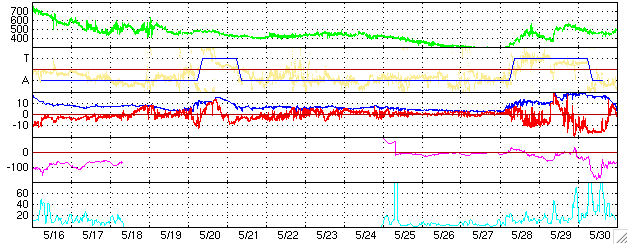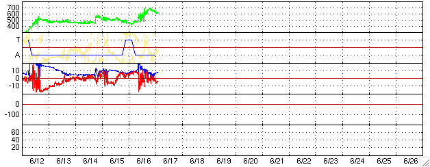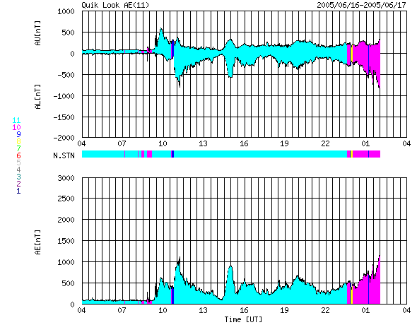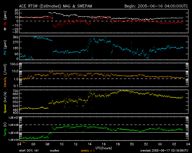 2005/ 6/17 12:22 更新 太陽風の速度が高速です(600km/秒)。オーロラも活発になっています。775黒点群がM4.0のフレアを起こしました。 担当 篠原 16日17時(世界時16日8時)頃から、太陽風が大きく乱れています。 初めに速度が450km/秒から550km/秒に急に上昇し、磁場強度も20nTへ一気に強まりました。 その後も太陽風の速度は緩やかに上昇を続け、17日3時(世界時16日18時)頃には700km/秒に達しました。 その後は下がって、現在は600km/秒程度です。 太陽風磁場強度は、初めに20nTととても強まりましたが、その後はゆっくりと弱まっています。 現在は7nT程度でしょうか。 南北成分を見ると、変動の初めの頃に大きな南向きが現れ、 その後もそれほど大きな値ではないものの、南寄りを中心に推移しています。 このため、AE指数には500〜1000nTの変動が連続的に観測されていて、磁気圏も活動的になっています。 太陽風磁場は現在も南向きが続いており、もうしばらく磁気圏の活発な活動が続きそうです。 この一連の変化は、14日と15日に発生したCME(太陽ガスの放出現象)と関連した現象だろうと思います。 太陽風の乱れは、明日にかけて緩やかにおさまっていくと思われます。 太陽では、775黒点群が最後に一番大きな活動を起こしました。 17日5時(世界時16日20時)にM4.0の中規模フレアが発生しています。 これも長時間継続するタイプのフレアで、CMEを伴っていそうです。 ただし、太陽の西の端で起きていますので、地球への影響はないでしょう。 また、このフレアの影響で、太陽プロトンの増加が観測されています。 GOES衛星の観測では、放射線の数値が30PFUに上昇しています。 ACEが観測した太陽風の磁場(1番上の枠、白線は全体の強度、赤線は南北成分) および、太陽風の密度(3番目の橙線)、速度(4番目の黄線) (c) NOAA/SEC ![]() リアルタイムAE指数 下段のAEグラフの値が高くなると、オーロラ活動が活発化しています。 (c) 京都大学, NICT ![]() 27日の太陽周期に合わせたデータプロット (太陽風版) 太陽が同じ面を地球に向けていた27日前の変化から、今後を予想することができます。 (c) NICT