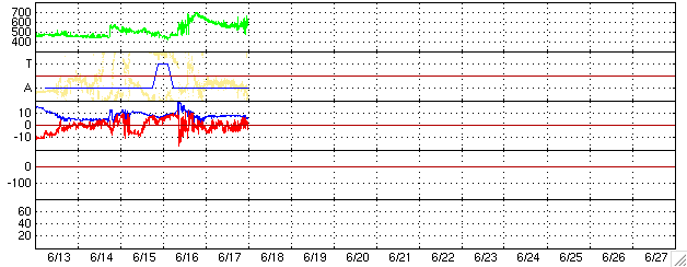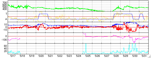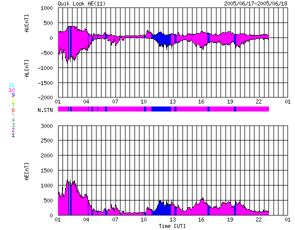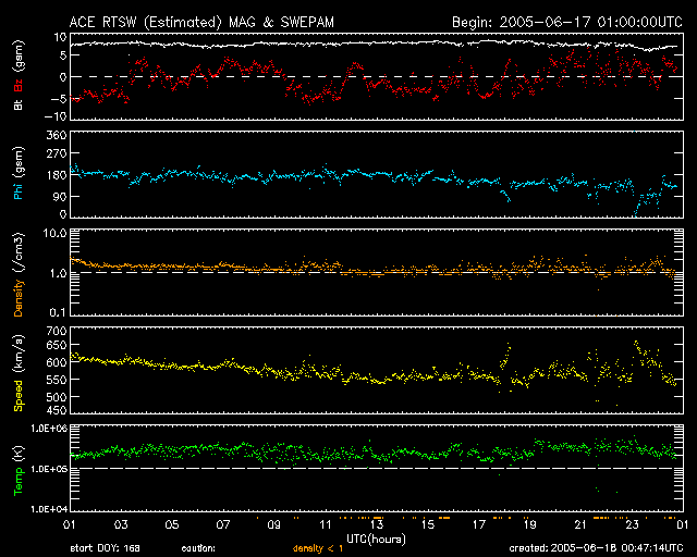 2005/ 6/18 09:50 更新 太陽風の高速状態が続いています(550km/秒)。オーロラ活動もやや活発です。 担当 篠原 太陽風は速度550〜600km/秒の高速状態が続いています。 昨日、CME(太陽ガスの放出現象)の影響で、速度が700km/秒にまで上昇し、 その後緩やかに速度を下げ続けていましたが、 550km/秒まで下がったところで安定し、以後半日ほどこの状態が続いています。 太陽風磁場も7nTとやや強めで、南北成分は-5nTから+5nTの間をゆらゆら変化し続けています。 南向き成分が頻繁に現れているため、オーロラ活動は刺激を受け続けていて、 AE指数で500〜1000nTの活動が頻繁に観測されています。 CMEによる高速風は今日いっぱいくらいで通り過ぎると思われます。 太陽風の乱れは次第におさまっていくでしょう。 現在、SOHO衛星EIT284カメラの観測が停止しており、 コロナホールの状況が分かりにくくなっています。 27日周期の図を見ると、前周期のデータには目立った太陽風の乱れは無く、 今後5日程度は穏やかな状態が続きそうです。 昨日のM4.0中規模フレアに伴って発生していた、 太陽からの高エネルギープロトンの増加は終わりました。 最大で40PFU程度に達しました。 太陽面では、活発に活動を続けていた775, 776黒点群が とうとう向こう側に行ってしまいました。 現在は、中央やや南(下)に779黒点群が見えています。 こちらも規模が大きく、小規模フレアの発生に注意が必要です。 ACEが観測した太陽風の磁場(1番上の枠、白線は全体の強度、赤線は南北成分) および、太陽風の密度(3番目の橙線)、速度(4番目の黄線) (c) NOAA/SEC ![]() リアルタイムAE指数 下段のAEグラフの値が高くなると、オーロラ活動が活発化しています。 (c) 京都大学, NICT ![]() 27日の太陽周期に合わせたデータプロット (太陽風版) 太陽が同じ面を地球に向けていた27日前の変化から、今後を予想することができます。 (c) NICT