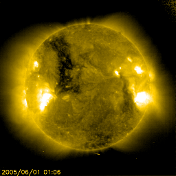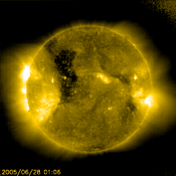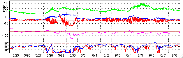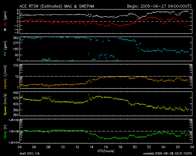 2005/ 6/28 12:35 更新 太陽風は穏やかで、磁気圏は静穏です。これから、太陽風に乱れが発生するかもしれません。 担当 篠原 現在の太陽風は、速度380km/秒、磁場強度5nTで通常の状態です。 28日6時(世界時27日21時)頃に、地球は太陽風磁場のセクター境界を越えています。 おおまかに「地球から太陽向き」だった太陽風の磁場が、 「太陽から地球向き」に切り替わっています。 切り替わりに前後して、太陽風の密度や、磁場強度に多少の乱れが発生しています。 (磁気圏に目立った影響は及ぼしていません) 25日に発生したCMEの影響が現れるとすると、そろそろだと思います。 時間がかかっていることもあり、たいした乱れにはならないと思いますが、 もうしばらく太陽風の変化に注目する必要があるでしょう。 その後は、一旦穏やかになりますが、 4〜5日後くらいにコロナホールによる太陽風の乱れが発生しそうです。 SOHO EIT284の太陽写真をご覧ください。 太陽の東側(左側)に濃く大きなコロナホールが広がっているのが分かります。 比較のために、2枚目に27日前の写真を並べています。 大まかにはコロナホールは同じ状態を保っているようです。 前周期は、650km/秒くらいに速度が上昇しました。 太陽のフレア活動は静かな状態です。 まだ写真には見えていませんが、781黒点群が東から上ってきました。 明日になれば、様子が分かってくるでしょう。 放射線帯の高エネルギー電子がやや増加しています。 ぎりぎりですが、GOES 10の観測値が警戒ラインに達しています。 明日にかけて緩やかにもう一段上がってくるかもしれません。 SOHO衛星のEIT284カメラの映像 (c) SOHO (ESA & NASA)