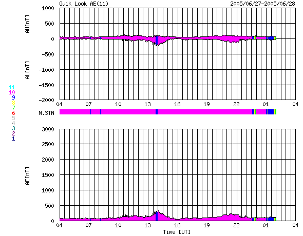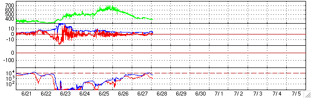 ACEが観測した太陽風の磁場(1番上の枠、白線は全体の強度、赤線は南北成分) および、太陽風の密度(3番目の橙線)、速度(4番目の黄線) (c) NOAA/SEC ![]() リアルタイムAE指数 下段のAEグラフの値が高くなると、オーロラ活動が活発化しています。 (c) 京都大学, NICT ![]() 27日の太陽周期に合わせたデータプロット (放射線帯電子版) 太陽が同じ面を地球に向けていた27日前の変化から、今後を予想することができます。 (c) NICT