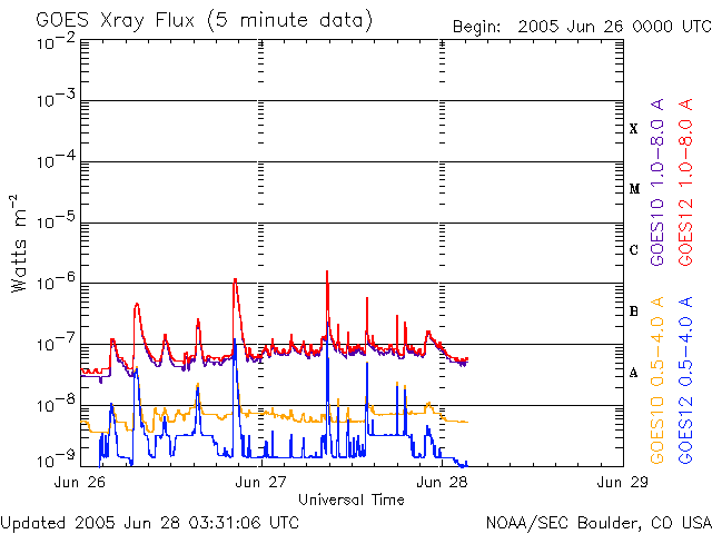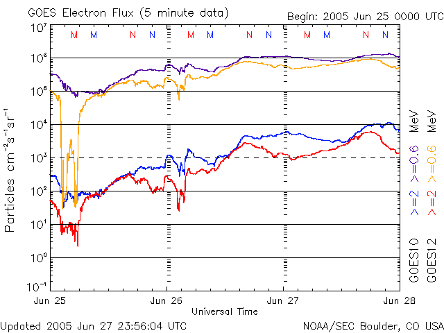 (c) NOAA/SEC ![]() SOHO衛星のMDIカメラによる太陽黒点 (c) SOHO (ESA & NASA) ![]() GOES衛星による、静止衛星軌道における高エネルギー電子の変化 (c) NOAA/SEC ![]() | |||||||||||||||||||||||||||||||||||||||||||||||||||||||