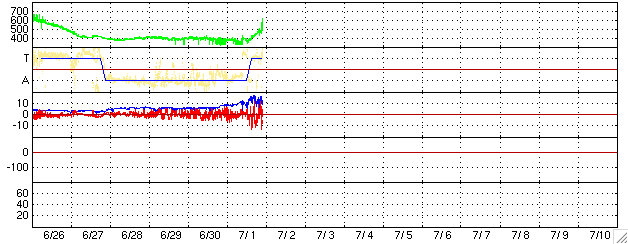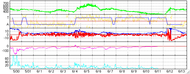 ACEが観測した太陽風の磁場(1番上の枠、白線は全体の強度、赤線は南北成分) および、太陽風の密度(3番目の橙線)、速度(4番目の黄線) (c) NOAA/SEC ![]() リアルタイムAE指数 下段のAEグラフの値が高くなると、オーロラ活動が活発化しています。 (c) 京都大学, NICT ![]() 27日の太陽周期に合わせたデータプロット (太陽風版) 太陽が同じ面を地球に向けていた27日前の変化から、今後を予想することができます。 (c) NICT