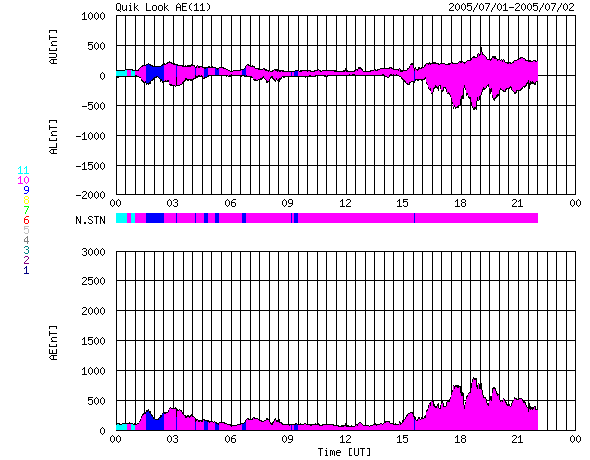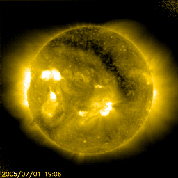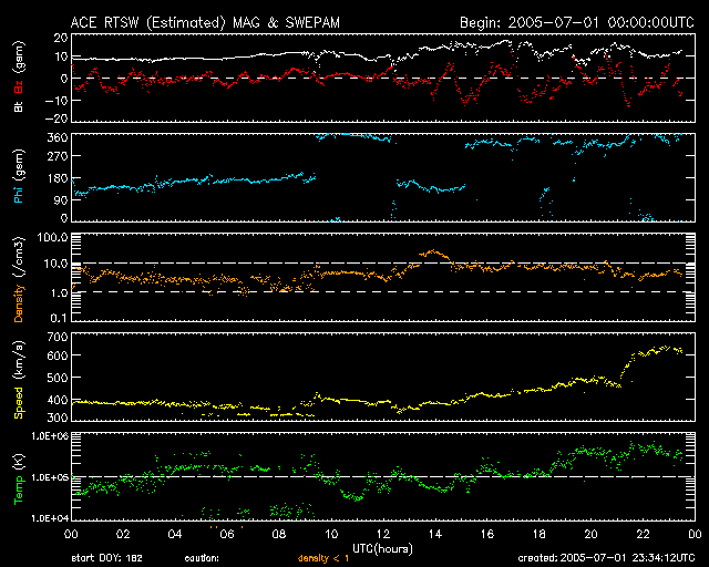 2005/ 7/ 2 08:38 更新 太陽風の速度が上がっています(600km/秒)。コロナホールの影響が及び始めた様です。 担当 篠原 コロナホールによる高速太陽風の領域に地球が入った様です。 ACE衛星の観測によると、1日22時(世界時1日13時)頃から太陽風の速度が緩やかに上昇を始め、 2日7時(1日22時)頃に600km/秒に達しています。 磁場の強度は10nT。昨日から継続しています。 速度が上昇を始めた頃から、南北成分が大きく振れるようになっています。 このため、磁気圏にエネルギーが流れ込むようになり、 オーロラ活動の指標であるAE指数のグラフが500〜1000nTのやや活発な活動を記録しています。 コロナホールの高速風は今日から明日にかけて続くと思われます。 そして、4日には下がり始めるのではないでしょうか。 それまでは、太陽風磁場の南向きに応じて、磁気圏の活動も活発になるでしょう。 太陽面では、5つの黒点群の番号が記されています。 一気ににぎやかになってきました。 まだそれほど活動的ではない様ですが、さらに発達が続くと、 フレアを起こし始めるかもしれません。 今後の変化に注意する必要がありそうです。 SOHO衛星のEIT284カメラの映像 (c) SOHO (ESA & NASA)