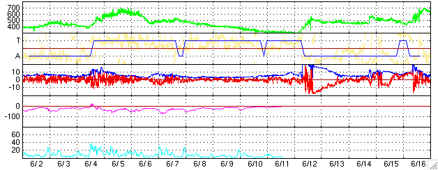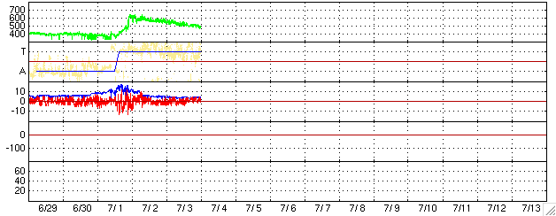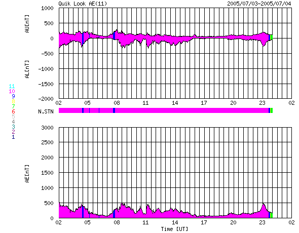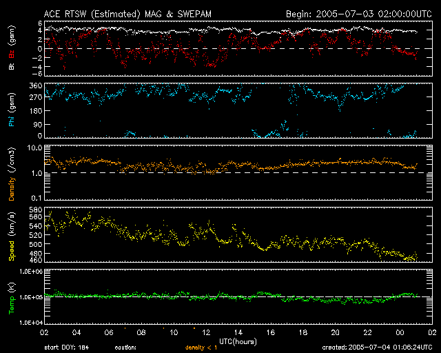 2005/ 7/ 4 10:06 更新 太陽風速度は低下して、通常の速度に近づいています(450km/秒)。太陽面で黒点群が増加してとてもにぎやかです。 担当 篠原 地球はコロナホールによる高速の太陽風領域を抜けつつあります。 昨日以降も、太陽風の速度は順調に低下を続け、現在450km/秒にまで下がっています。 太陽風磁場は強度が4nTで通常の強さです。 南北成分は南北に揺れていますが、速度、磁場強度ともに大きなものではないため、 大きな磁気圏活動は起こっていません。 AE指数のグラフでは、500nT程度の小規模活動が現れている程度です。 太陽風は更に速度を下げ、穏やかになっていくでしょう。 今のところ新しいコロナホールも見えず、太陽風は穏やかな状態が続きそうです。 これから、放射線帯の高エネルギー電子が増加する可能性があります。 まだ警戒レベルよりもずっと下ですが、GOESの観測では電子密度の増加が観測されています。 衛星の運用などでは、今後の電子密度の変化に注意が必要でしょう。 太陽面はとてもにぎやかになっています。 781から788まで8つの黒点群が分布しています。 782、786群が小規模フレアを起こしていますし、 783群も黒点分布が複雑化していて、エネルギーがたまっているようです。 今後も中小規模のフレアが発生する可能性があります。 ACEが観測した太陽風の磁場(1番上の枠、白線は全体の強度、赤線は南北成分) および、太陽風の密度(3番目の橙線)、速度(4番目の黄線) (c) NOAA/SEC ![]() リアルタイムAE指数 下段のAEグラフの値が高くなると、オーロラ活動が活発化しています。 (c) 京都大学, NICT ![]() 27日の太陽周期に合わせたデータプロット (太陽風版) 太陽が同じ面を地球に向けていた27日前の変化から、今後を予想することができます。 (c) NICT